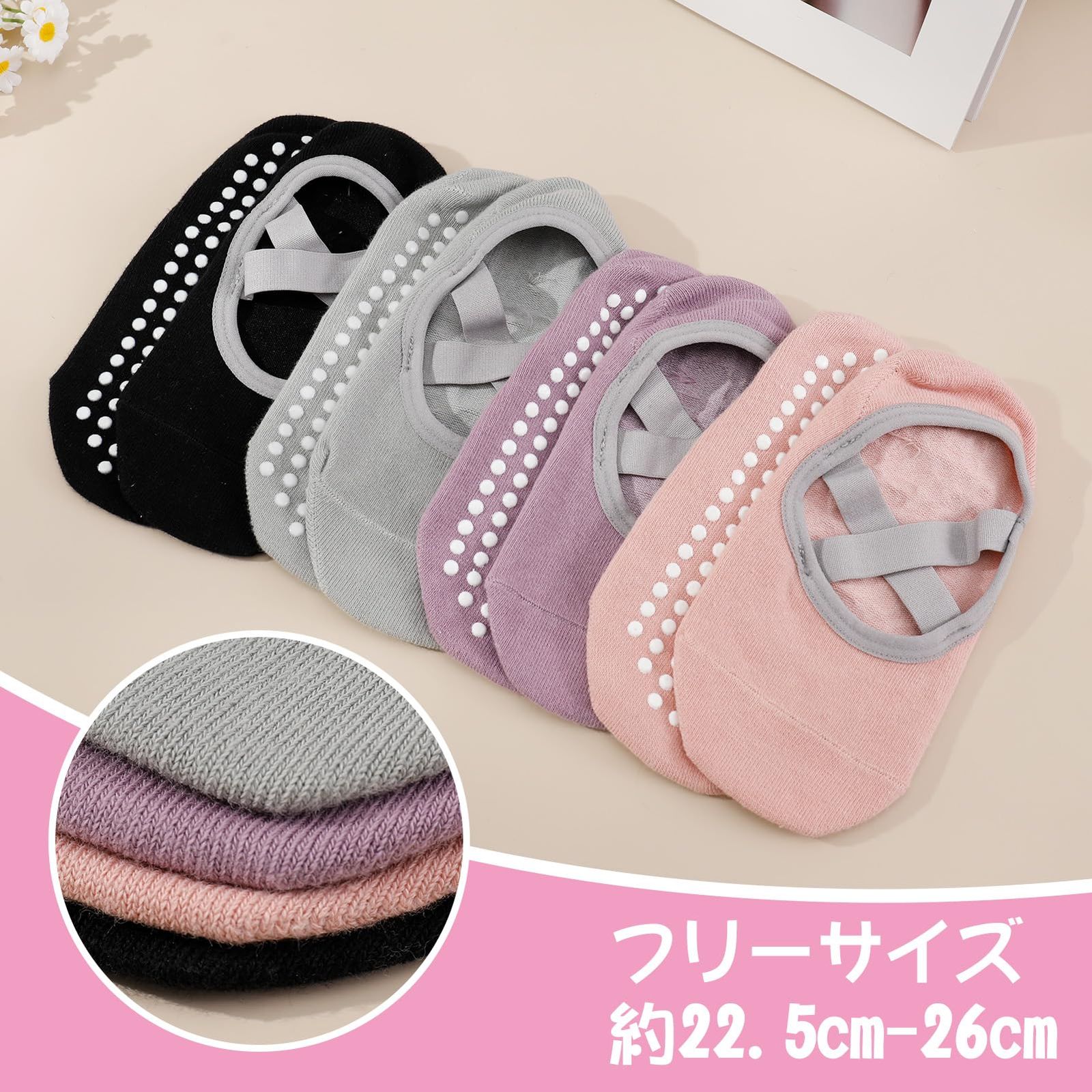 【セット内容】ヨガソックス:4色4足セット、カラー:グレー、ブラック、ピンク、紫、サイズ:フリーサイズ(約22.5cm-26cm、ほとんどの女性に適します。)