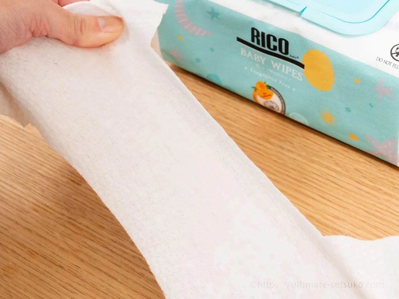 無香料、パラベンフリー、アルコール(エタノール)フリー、無塩素漂白パルプ素材の赤ちゃん用おしりふき