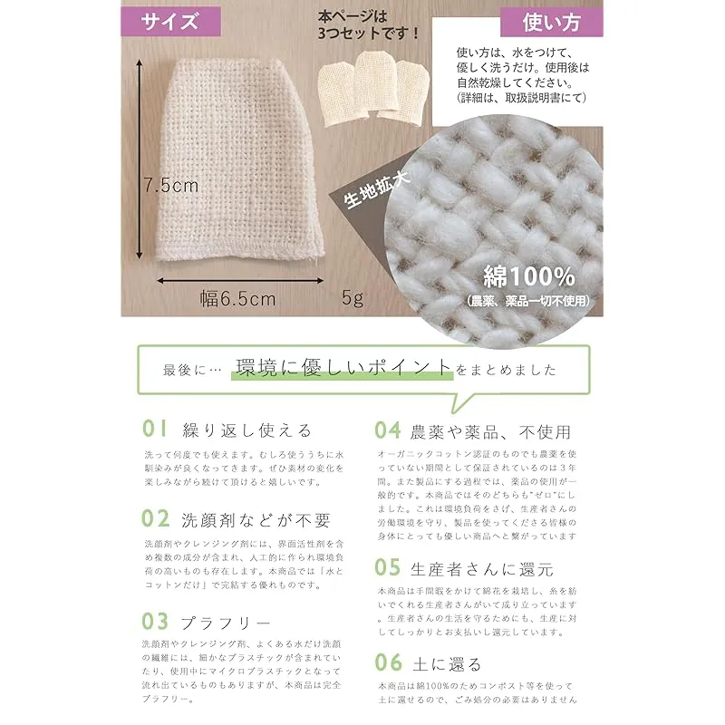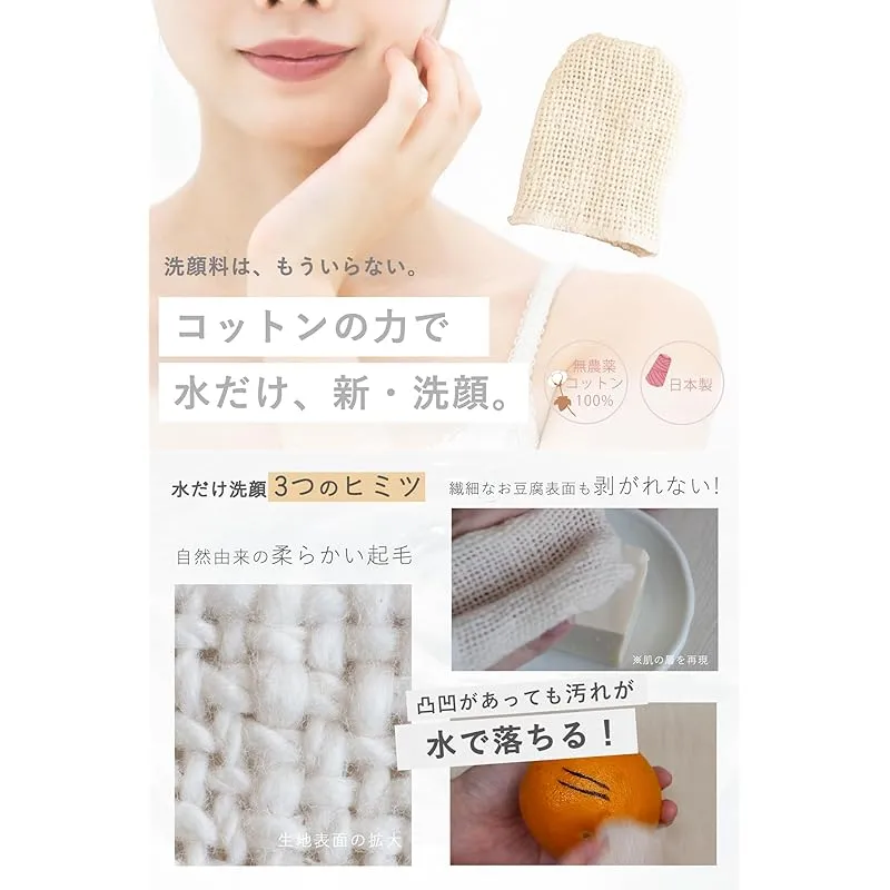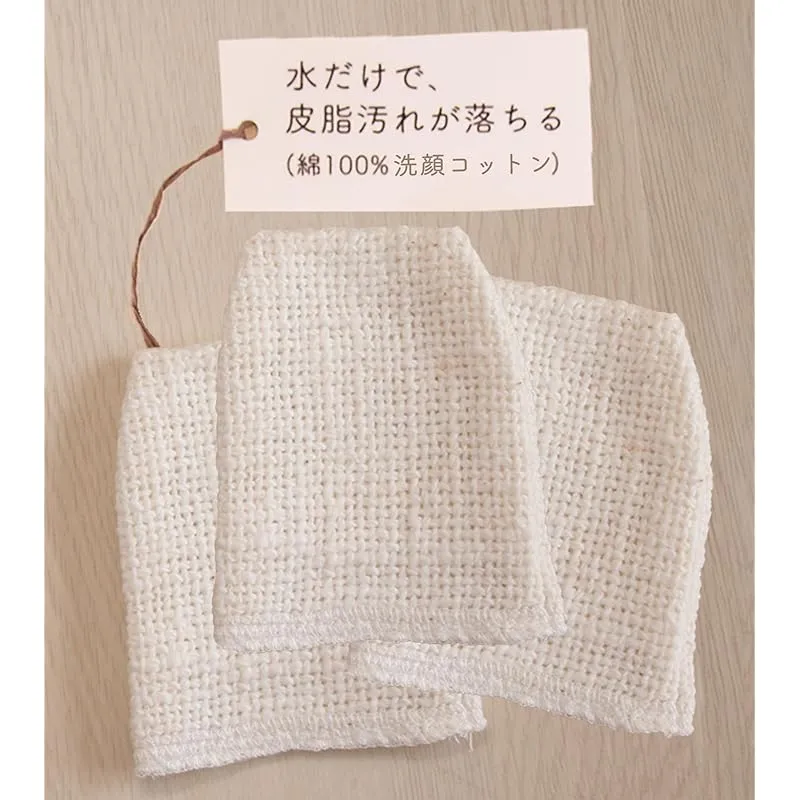 【石鹸不要の洗顔】自然な綿花をそのまま生地にした特殊製法により、石鹸なくても余分な油脂を洗い落とし、適度な油分をお肌に残します。