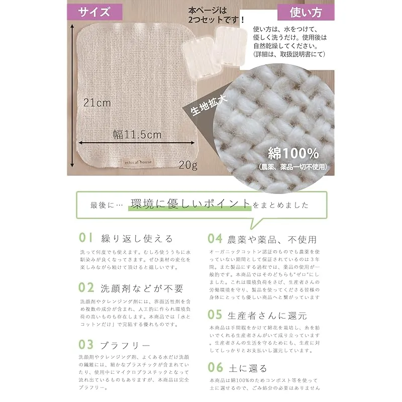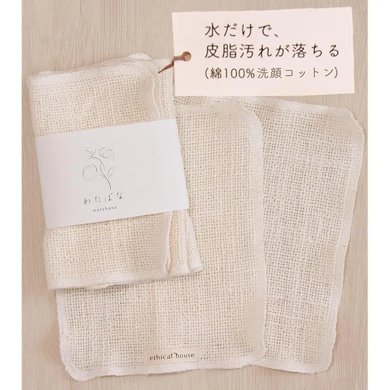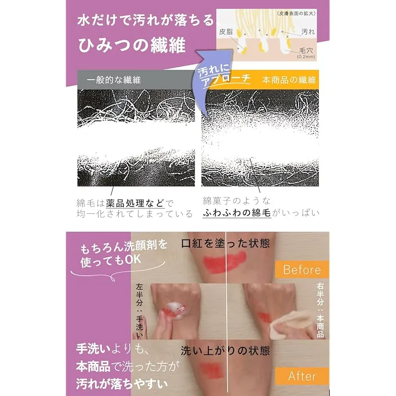 【石鹸不要の洗顔】自然な綿花をそのまま生地にした特殊製法により、石鹸なくても余分な油脂を洗い落とし、適度な油分をお肌に残します。