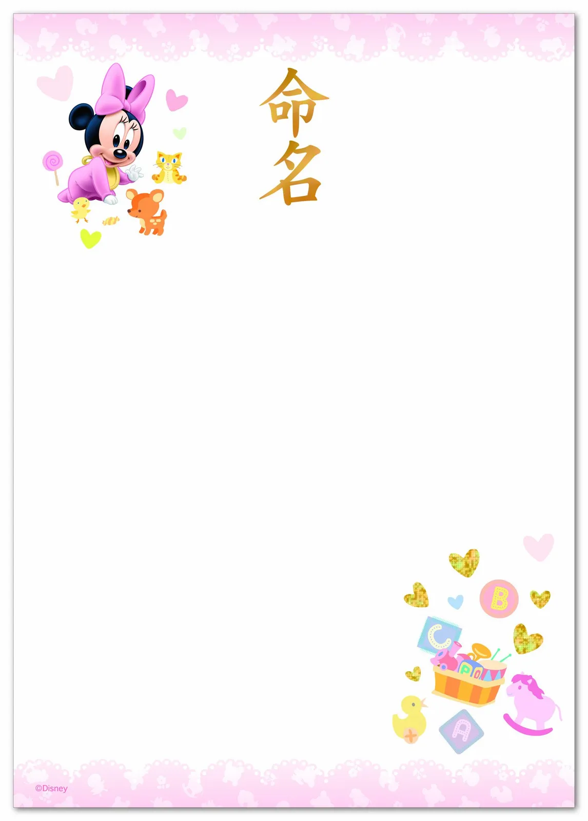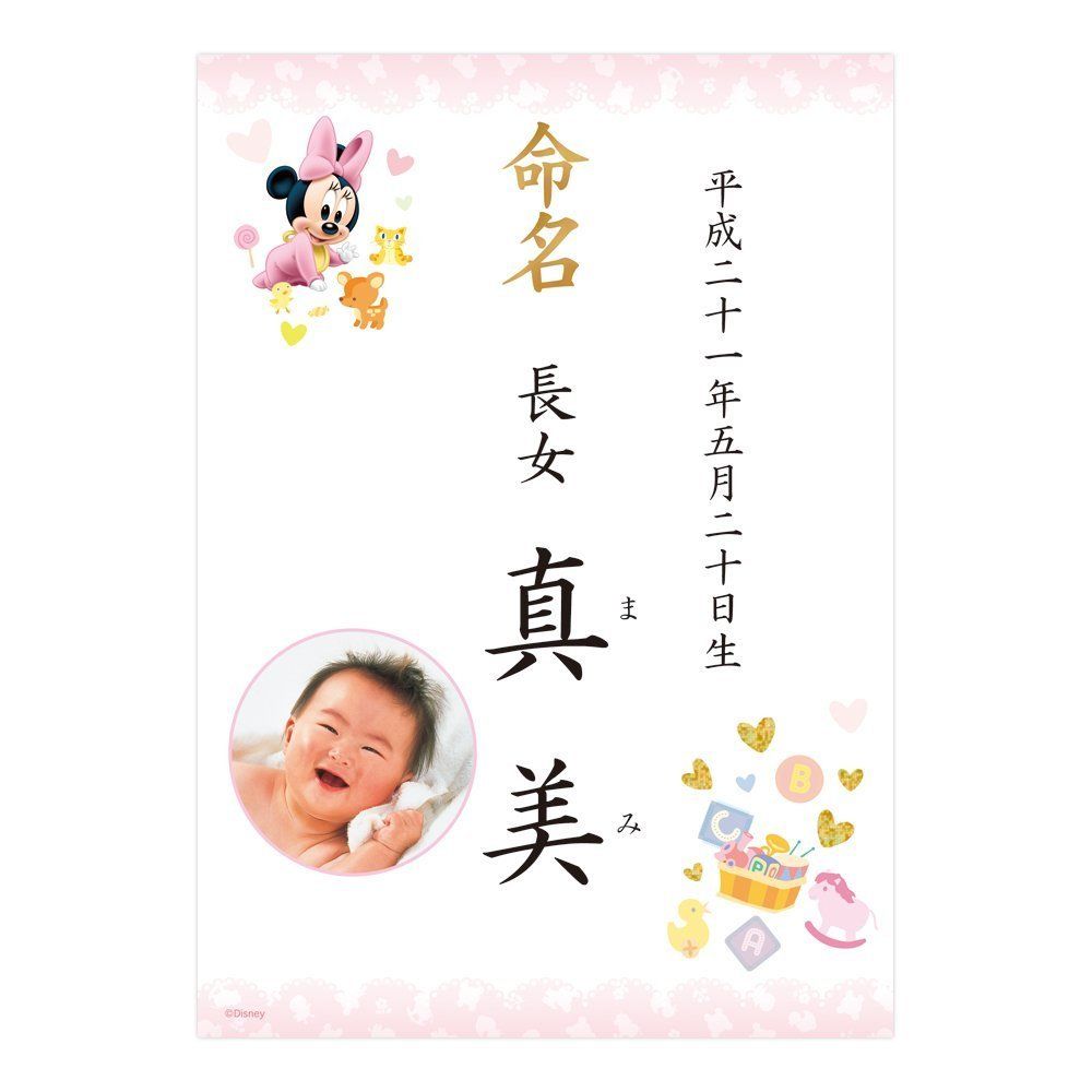 人気のベビーミニーの命名用紙です。A4サイズで、あらゆるインクジェットプリンタに対応。