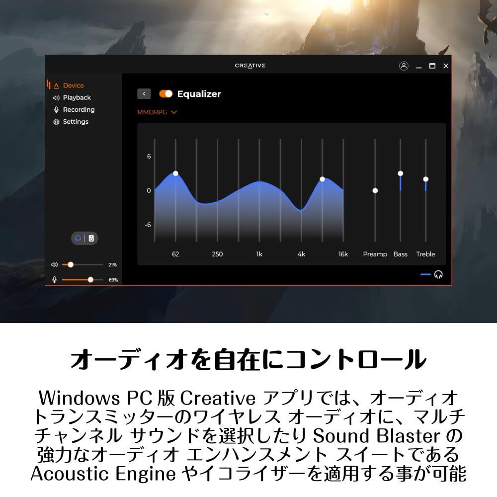 Windows PC版Creative アプリでは、オーディオ トランスミッターのワイヤレス オーディオに、マルチチャンネル サウンドを選択したりSound Blasterの強力なオーディオ エンハンスメント スイートであるAcoustic Engine※2やイコライザーを適用する事が可能