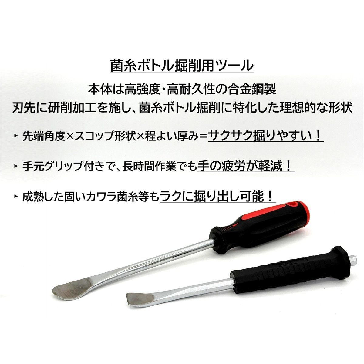 \菌糸ボトルの掘り出し作業を力強くサポート/