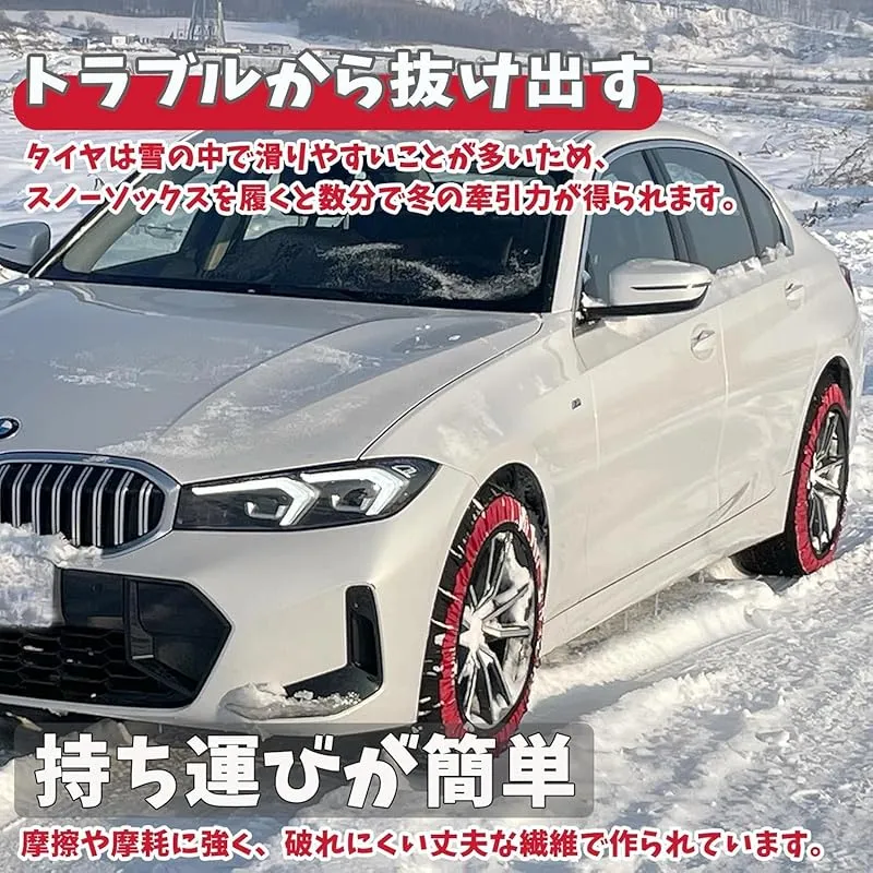 【布製タイヤすべり止め】 チェーン規制対応。緊急用タイヤすべり止めです。スノーチェーンの完璧な代替品: このタイヤ スノー ソックス 2 個セットは、コンパクトなキャリング ケースに折りたたんで、雪や氷の緊急事態に備えて車に保管できます。従来のタイヤ チェーンに伴う衝撃、騒音、リムの損傷が軽減され、よりスムーズな乗り心地をお楽しみいただけます。