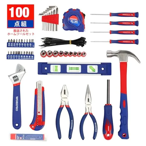 【セット内容】ラシオペンチ、精密ドライバー(2.5mm, 3.0mm, PH0, PH00)、 カッター、替え刃、差込角6.35mm(1/4インチ)の多機能ドライバーハンドル、差込角6.35mm (1/4インチ)のソケットセット(5、6、7、8、9、10、11、12、13mm)、ビットセット、ニッパープライヤー、爪ハンマー、内六角レンチ(1.5、2、2.5、3、4、5、5.5、6mm)、レベル、ビットセット、モンキーレンチ、プラスチックバンド。日曜大工に必要なものは一通り集まってきました。