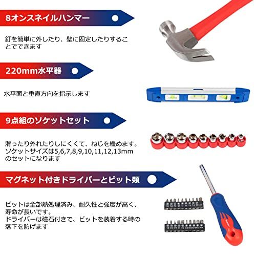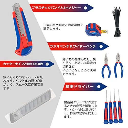 【家庭修理に憂いなし】家にあると便利な工具がほぼ揃っており、簡単な家具の組み立てや家電、水道などの修理に使えます。メンテナンス作業、点検、修理など、オフィスでもご家庭でも、あらゆる場面に対応できます。初心者向けのセットで大活躍できます。