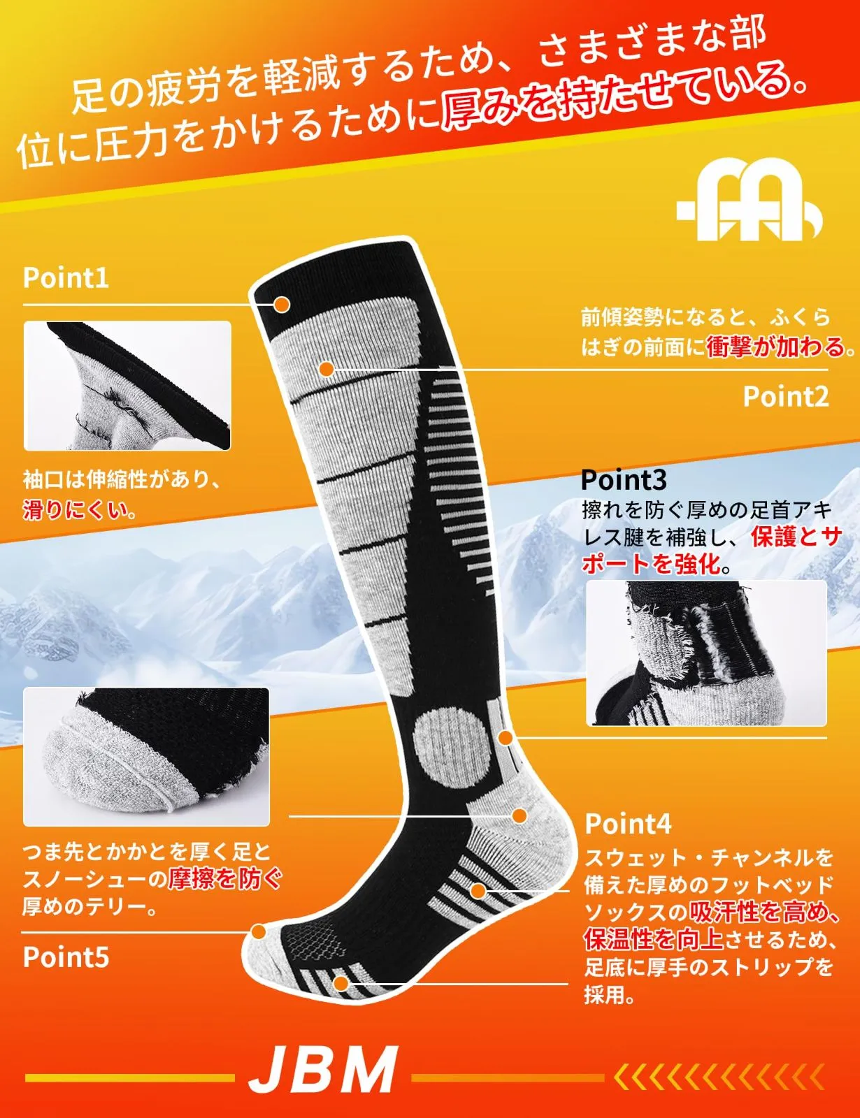 【保温・保冷・擦り傷防止】スキー用に特別にデザインされたこのソックスは、保温性と擦り傷を防ぐために様々な部分に厚みを持たせています。 ふくらはぎ前部は厚くし、スキーによる脚への衝撃を和らげ、足首は厚くし、擦り傷や足首の捻挫を防ぎ、かかとつま先は厚くし、衝撃を和らげ吸収し、擦り傷を防ぎます。