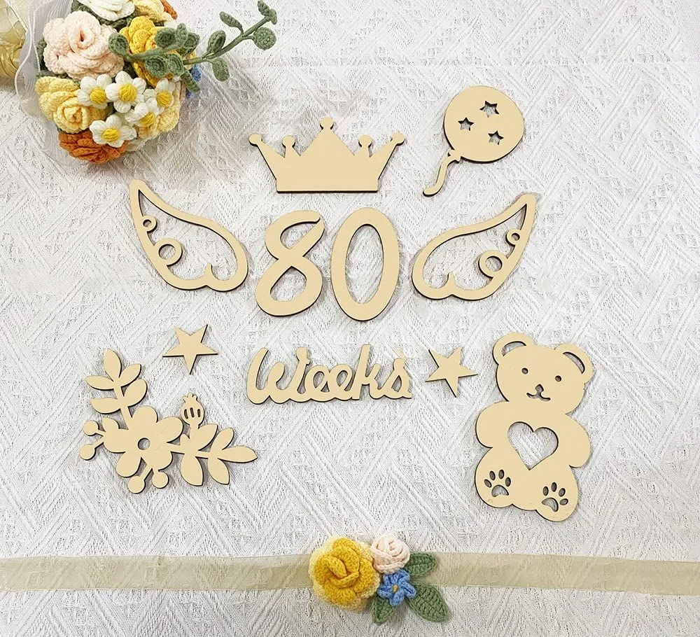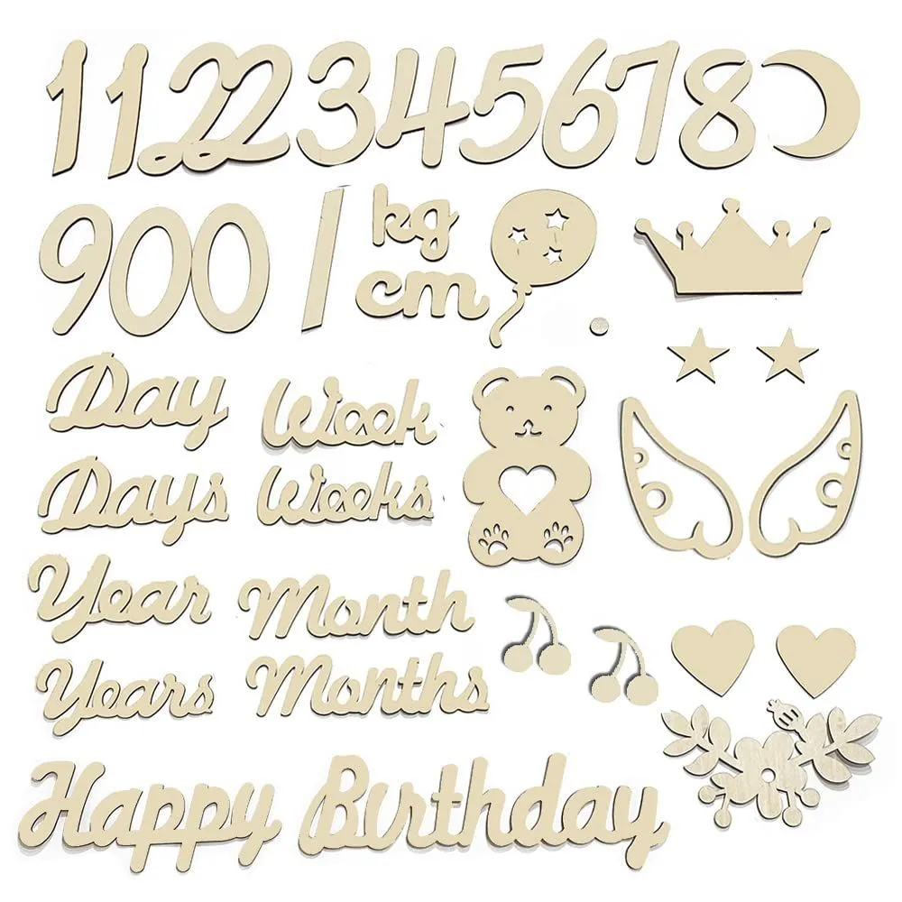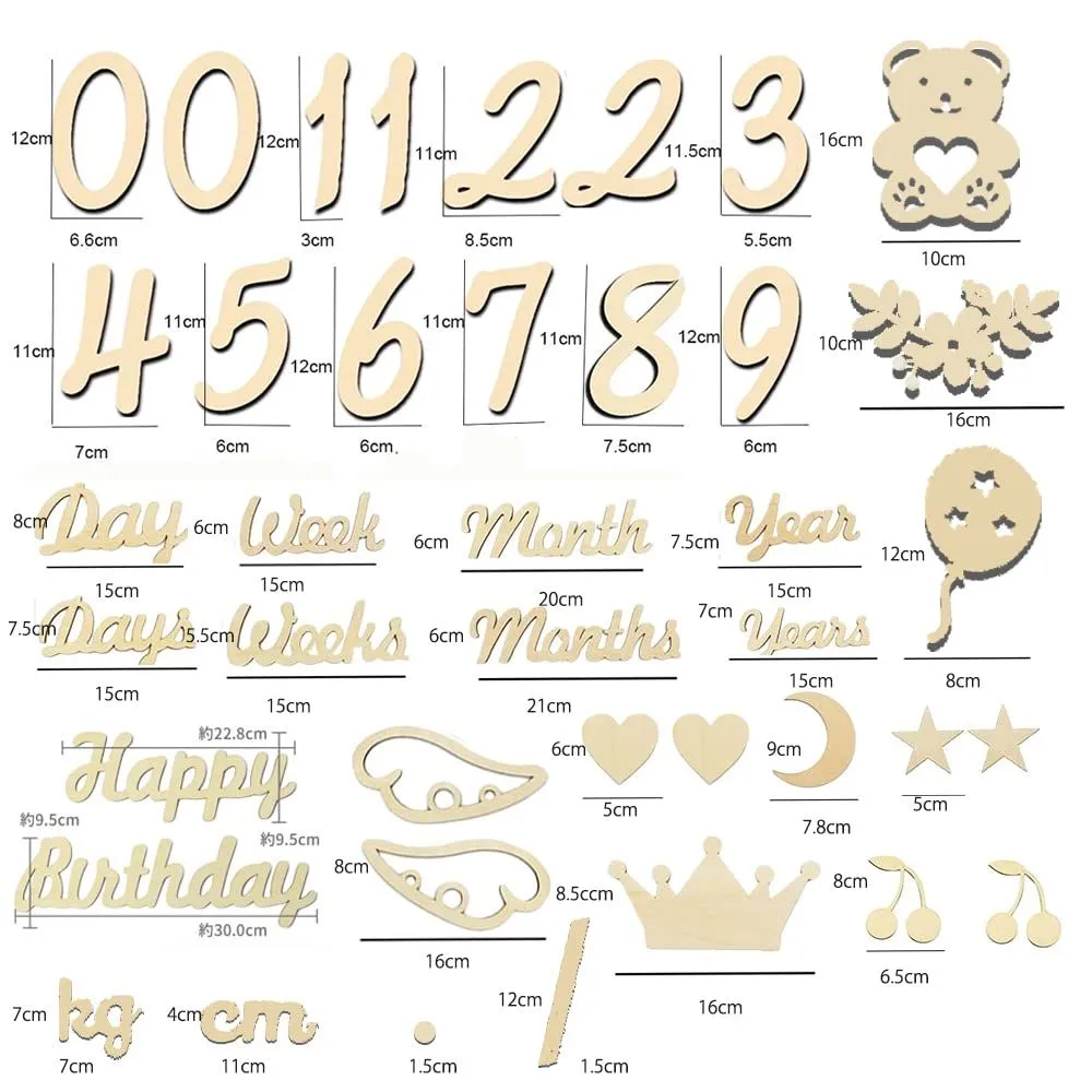 【セット内容】合計40枚セット、0*2枚、1*2枚、2*2枚、3~9各1枚、王冠*1枚、星*2枚、羽*2枚、ハート*2枚、花*1枚、熊*1枚、風船*1枚、点*1枚、斜線*1枚、サクランボ*2枚、kg、cm、happy、birthday、day、days、week、weeks、month、months、year、years各一枚、合計40枚、サイズ:写真欄にご参照ください。素材:ウッド、厚さ:約3.6mm