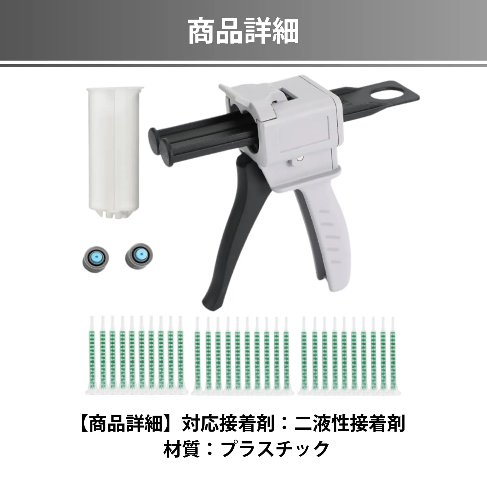【商品詳細】対応接着剤:二液性接着剤 全長:約83mm 外径:約7.6mm 内径:約5.3mm 直径:約9mm 出口内径:約1.5mm 出口外径:約4mm 材質:プラスチック