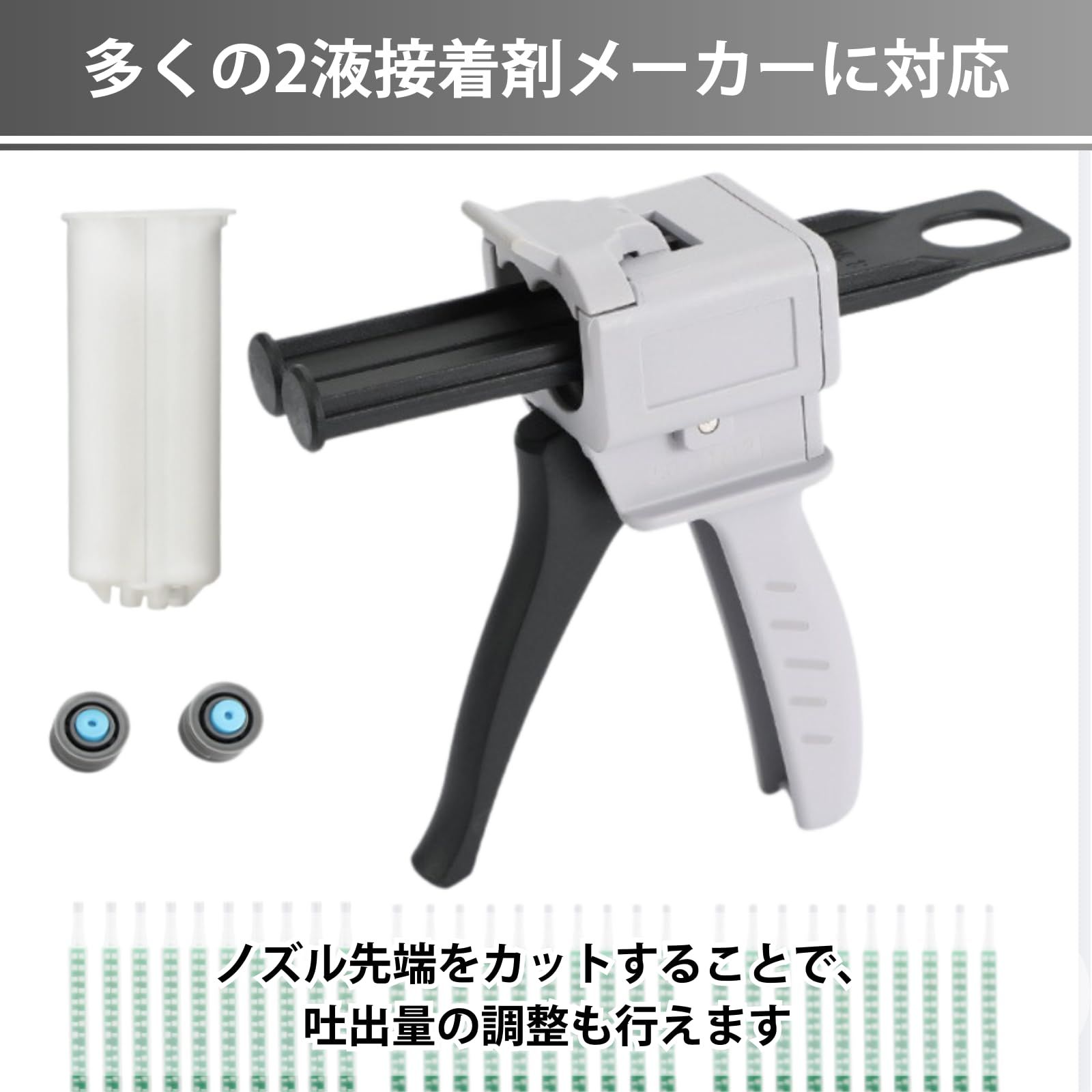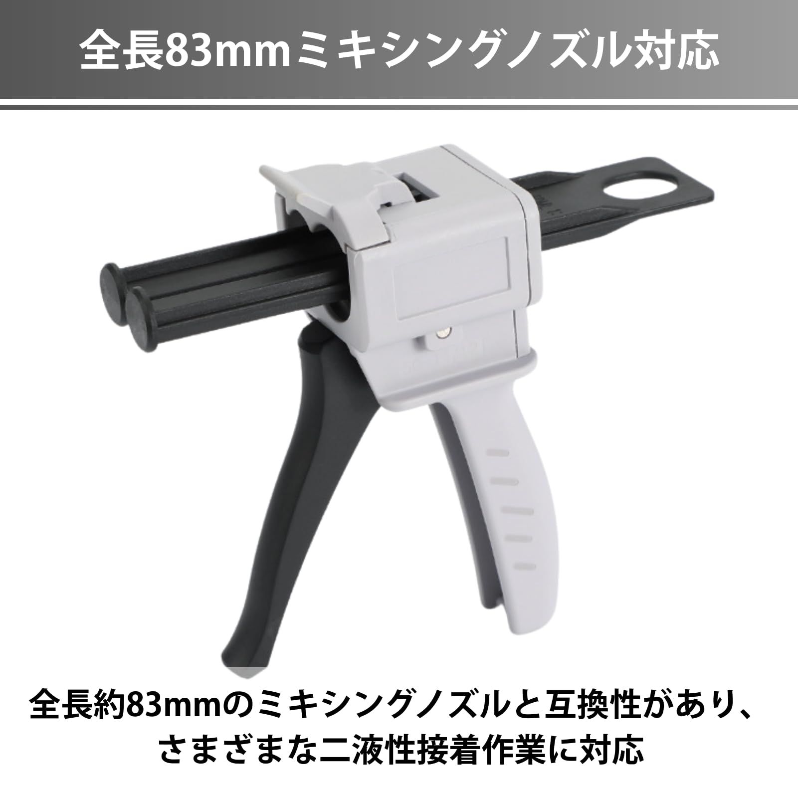 【全長83mmミキシングノズル対応】全長約83mmのミキシングノズルと互換性があり、さまざまな二液性接着作業に対応。安定した混合で作業効率が向上します。メグミックス、ロックタイト、3M、セメダインなど各種二液接着剤に使用可能。ノズル先端をカットすることで、吐出量の調整も行えます。