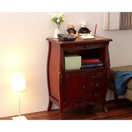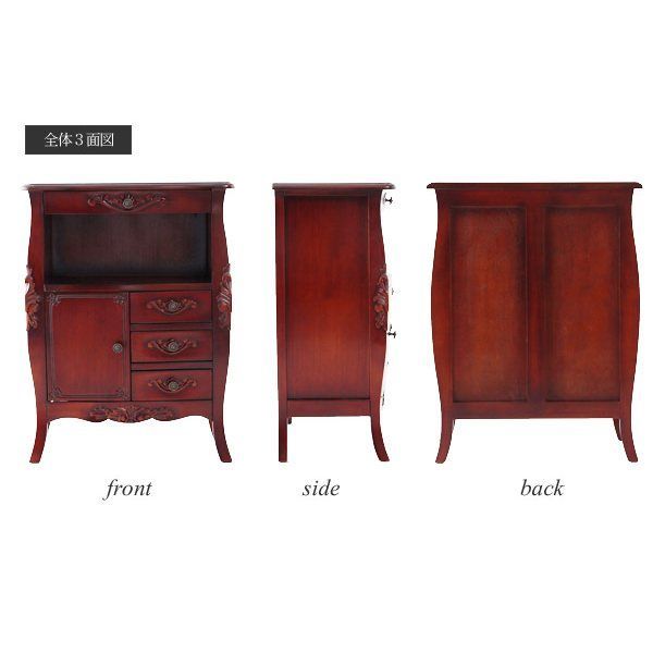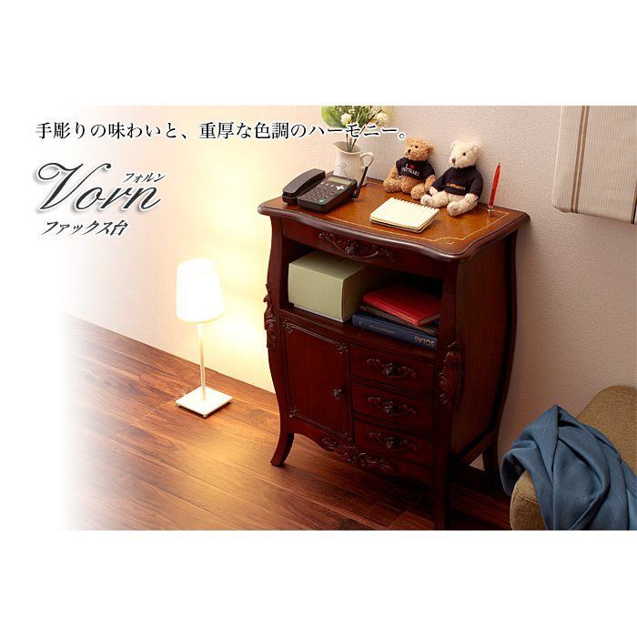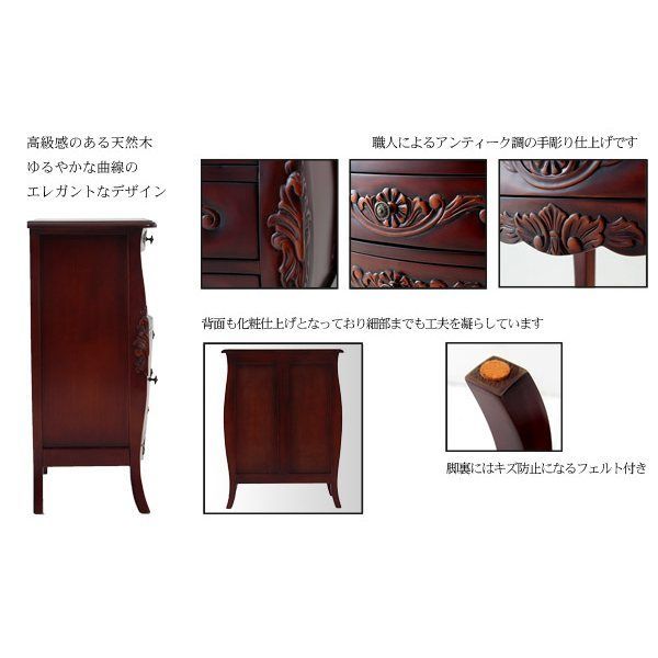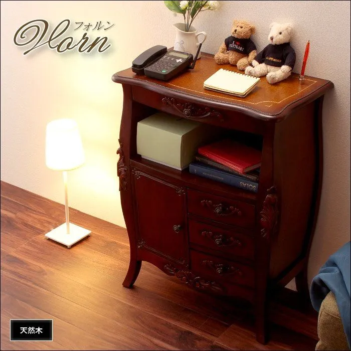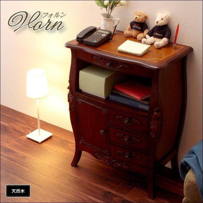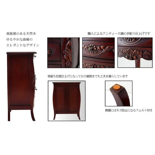 天然木の渋い風合いに、手彫りの彫刻やアンティーク調の取手がアクセントに。