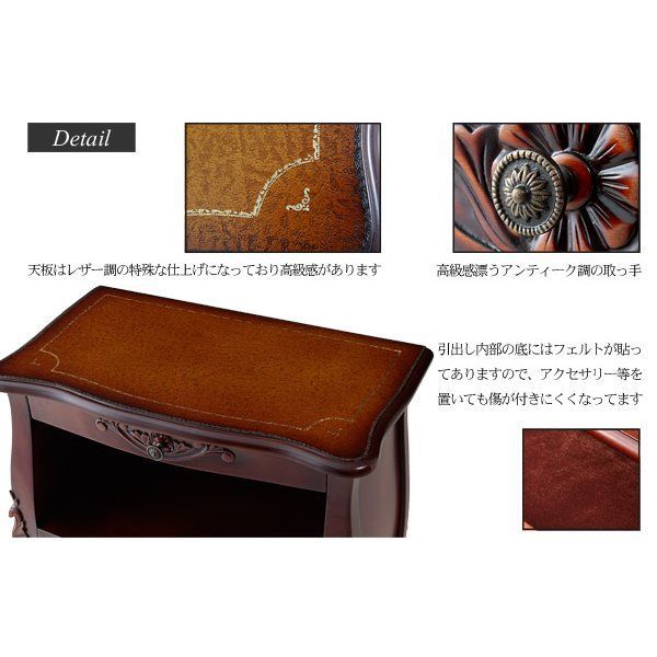 引き出しの内部底は、傷がつきにくいフェルト貼りになっているので、アクセサリーやガラス製品などを入れておくのにぴったりです。天板は上質感を高めたレザー調仕上げです。