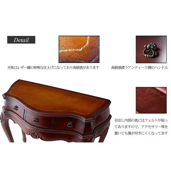 引き出しの内部底は、傷がつきにくいフェルト貼りになっているので、アクセサリーやガラス製品などを入れておくのにぴったりです。天板は上質感を高めたレザー調仕上げです。