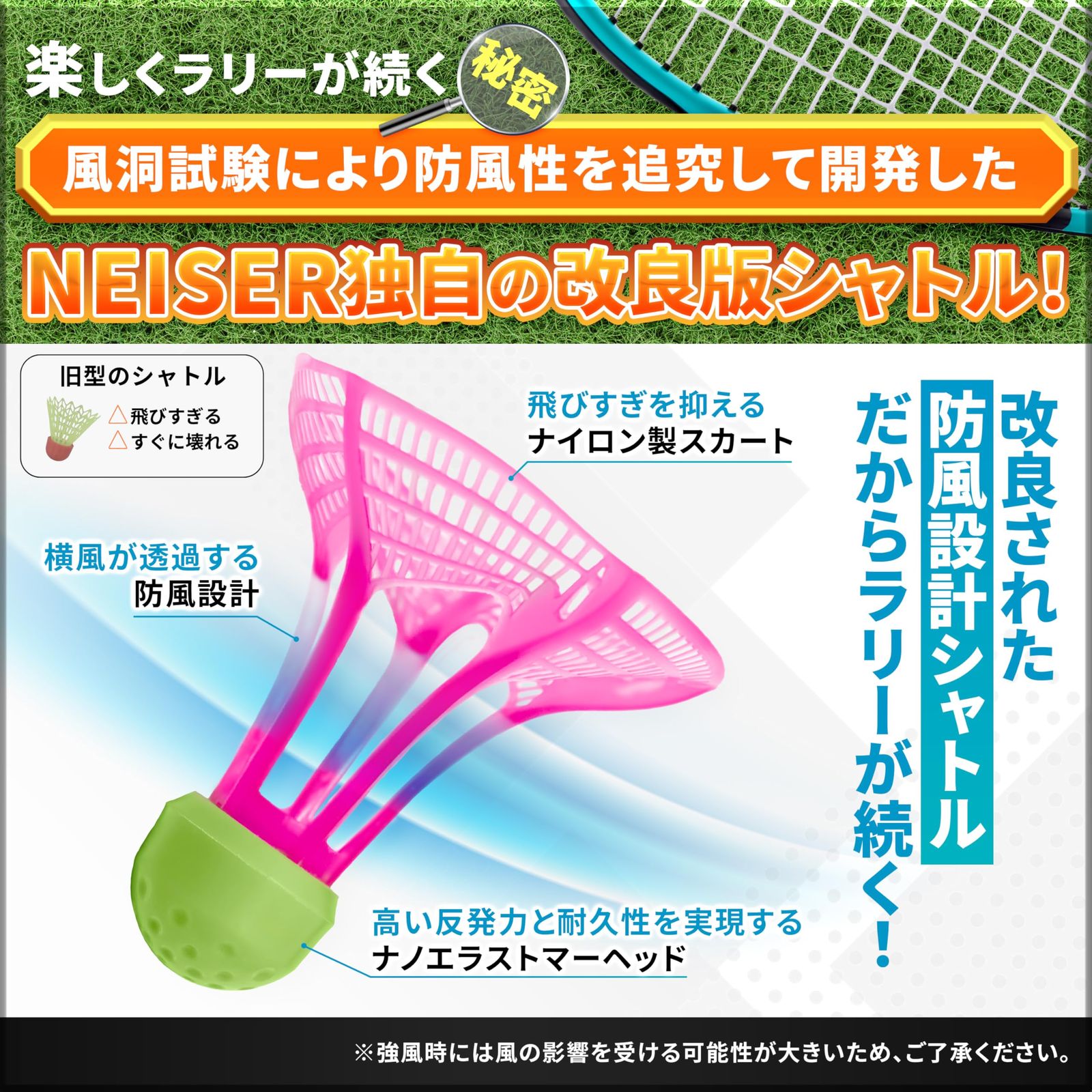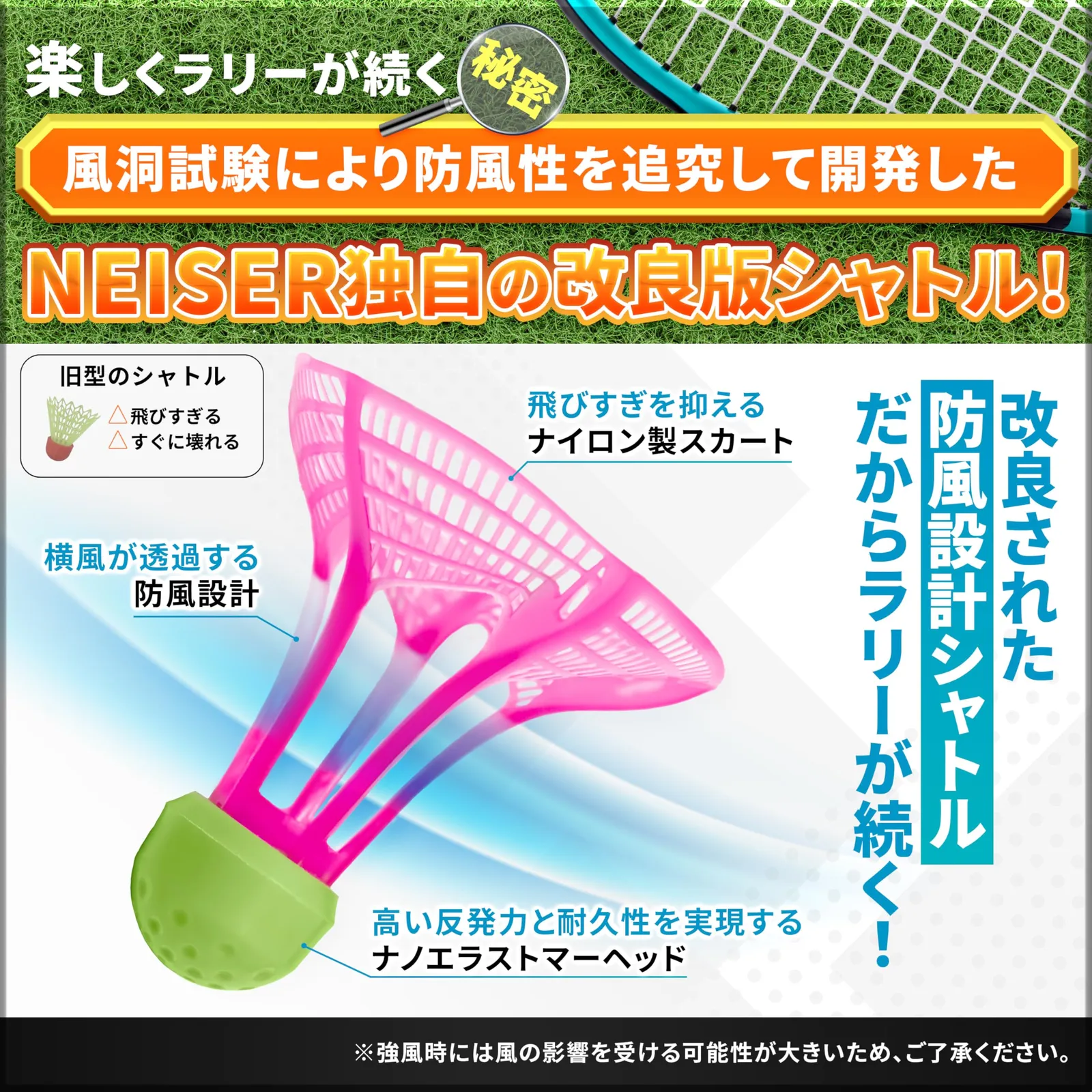 【独自の防風シャトル】付属のシャトルは風に強い設計&変形を防止するシャトルケース入り!屋外でもラリーが続きやすく快適なプレイを実現しました!