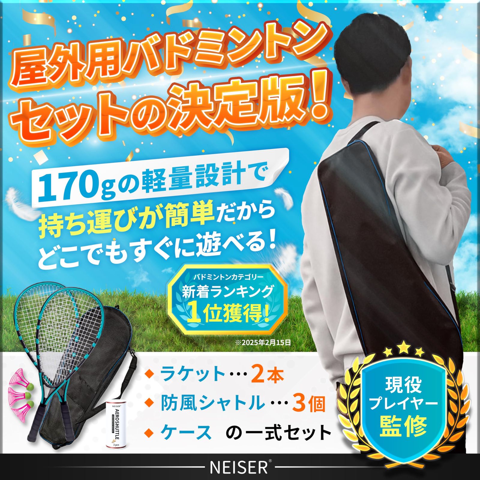【日本企画】NEISER アウトドアバドミントンセット [ラケット2本+防風シャトル3個+収納ケース] 初心者向け軽量設計 屋外でもラリーが続く 国内正規品