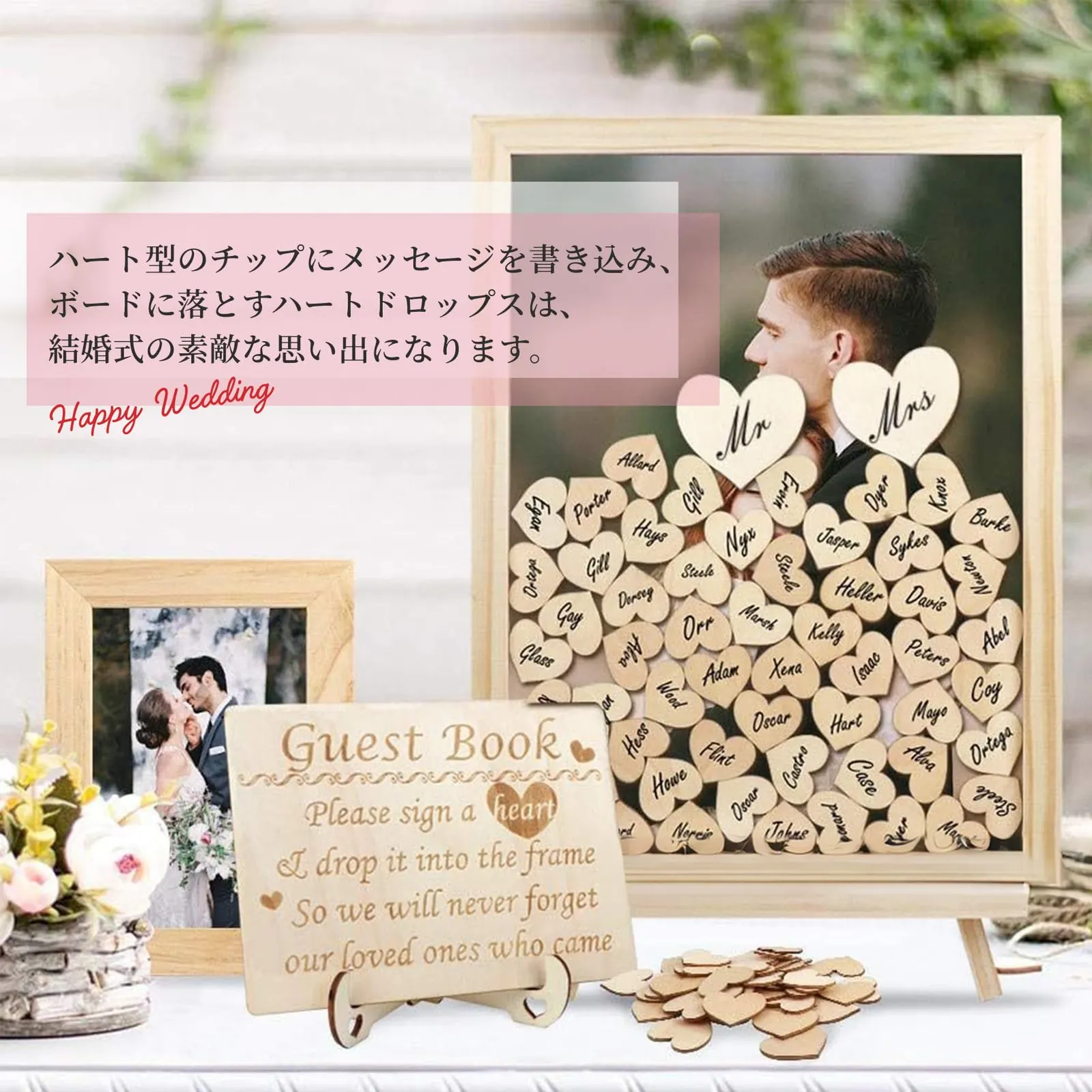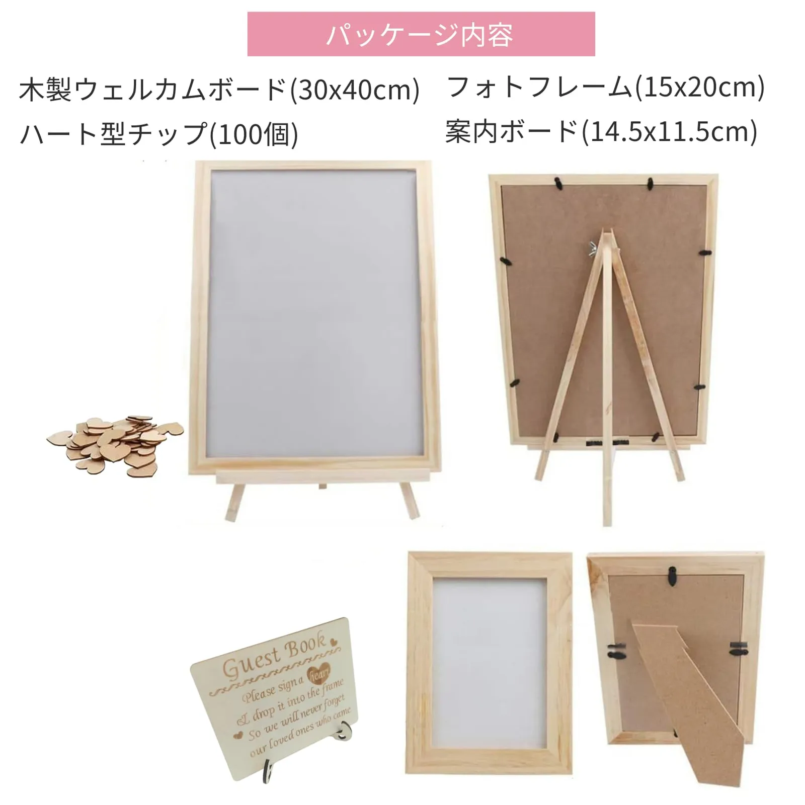 パッケージ内容:木製ウェルカムボード(30x40cm)&ハート型チップ(100個)、フォトフレーム(15x20cm)