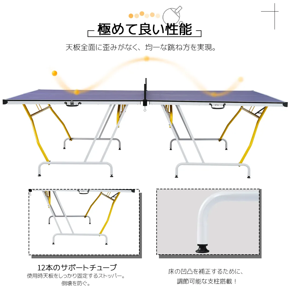 【極めて良い性能】天板全面に歪みがなく、均一な跳ね方を実現。12本のサポートチューブ。使用時天板をしっかり固定するストッパー。倒壊を防ぐ。床の凹凸を補正するために、調節可能な支柱搭載!