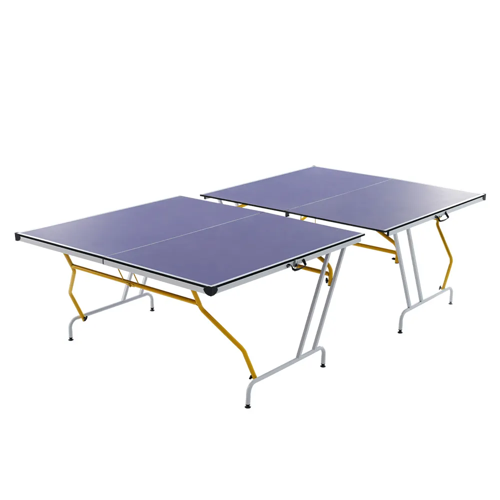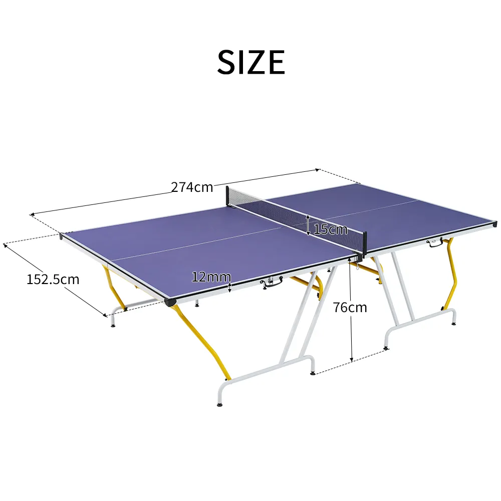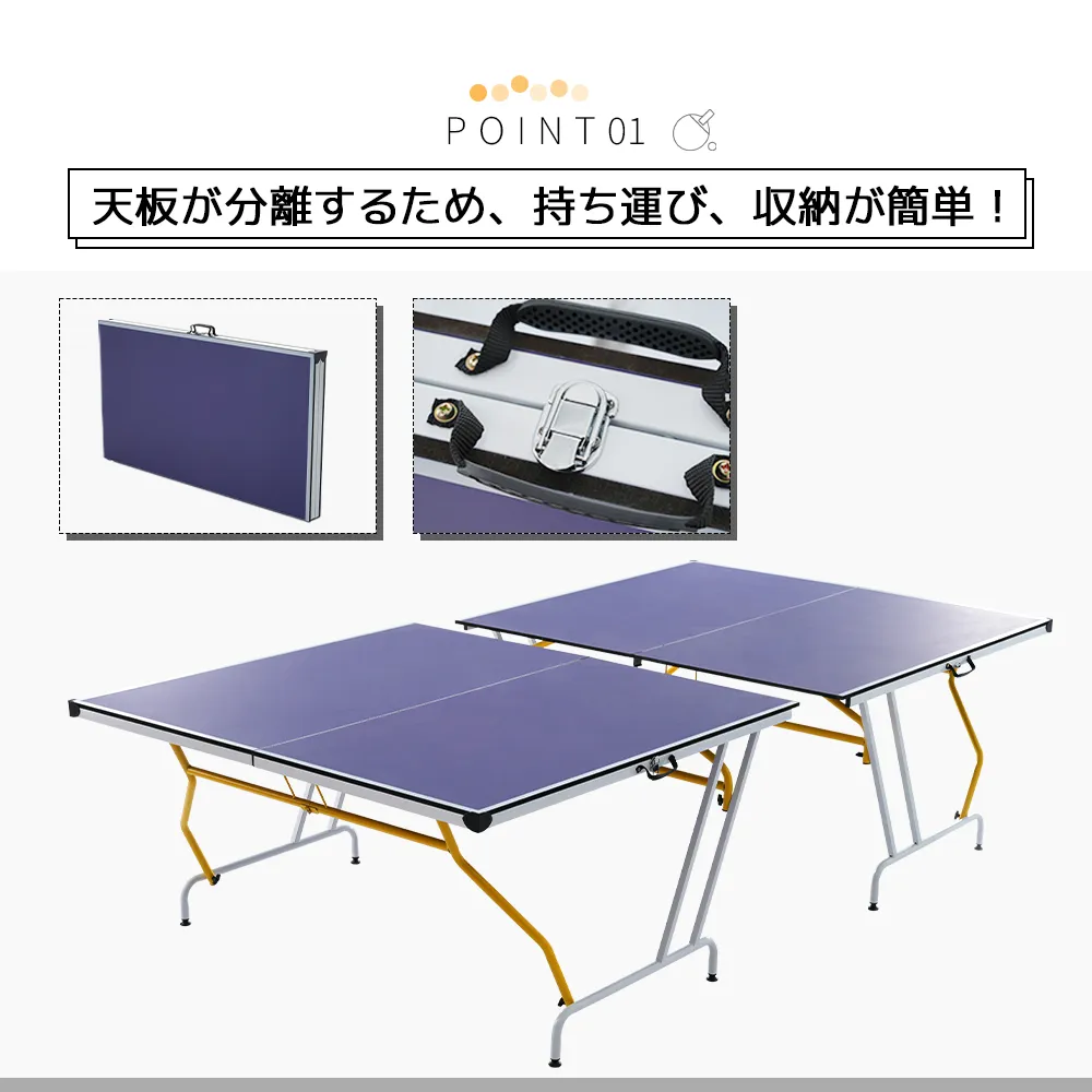 【組立簡単】約5分で組み立て完了 組立方法:①テーブルを展開します。②卓球台の脚をゆっくりと広げ、ネジで締めます。③4つのネジを締めてから、テーブルを裏返し、完成します。もう一方の側も同じ方法で組立ます。④ネットを取り付けます。