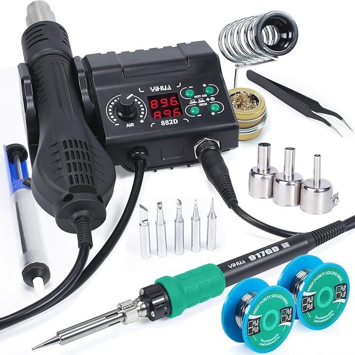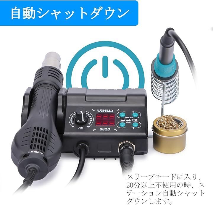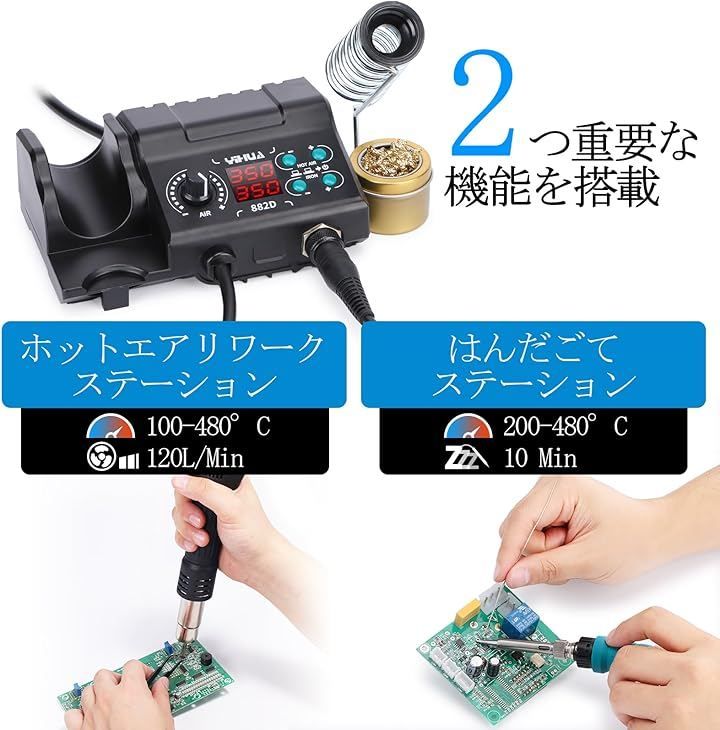 「2イン1」 YIHUA 882Dは超コンパクトなボディにハンダごてステーションとホットエアリワークステーションを統合します。