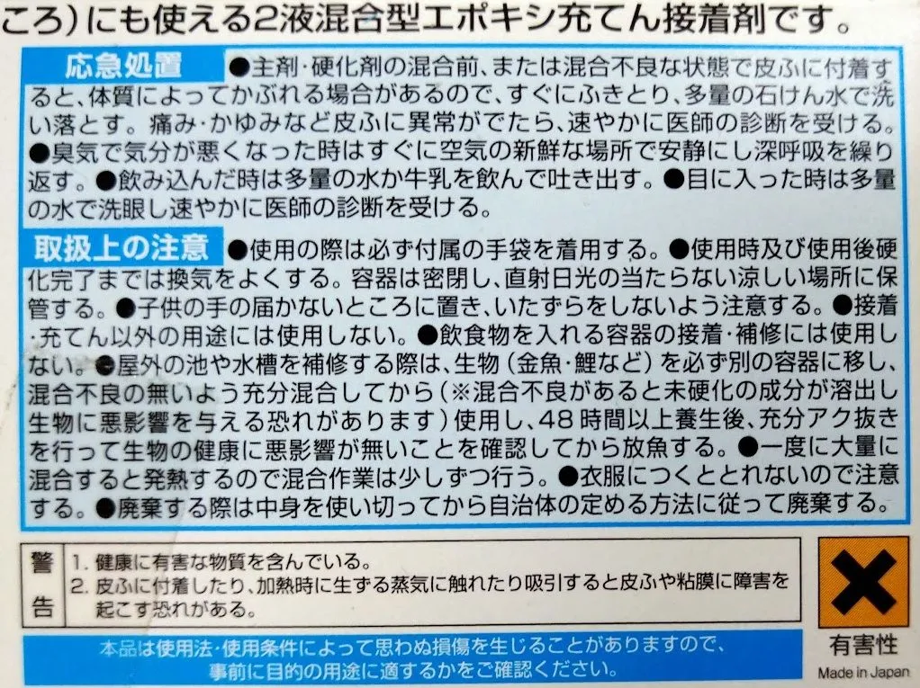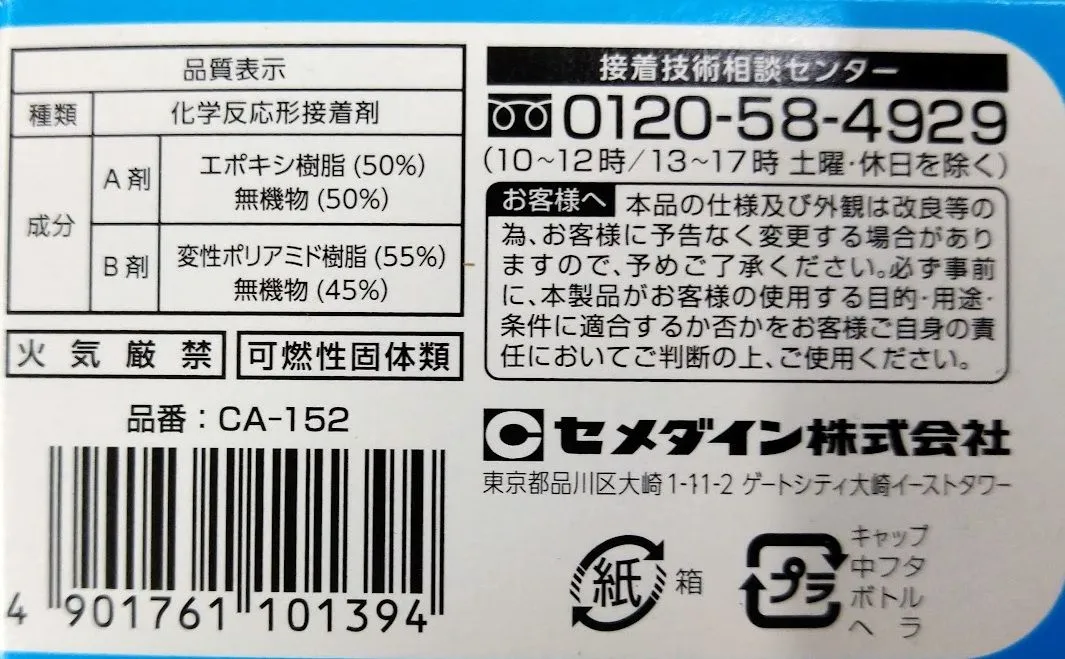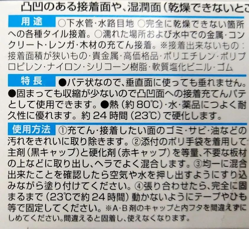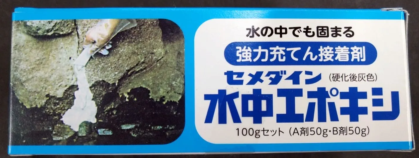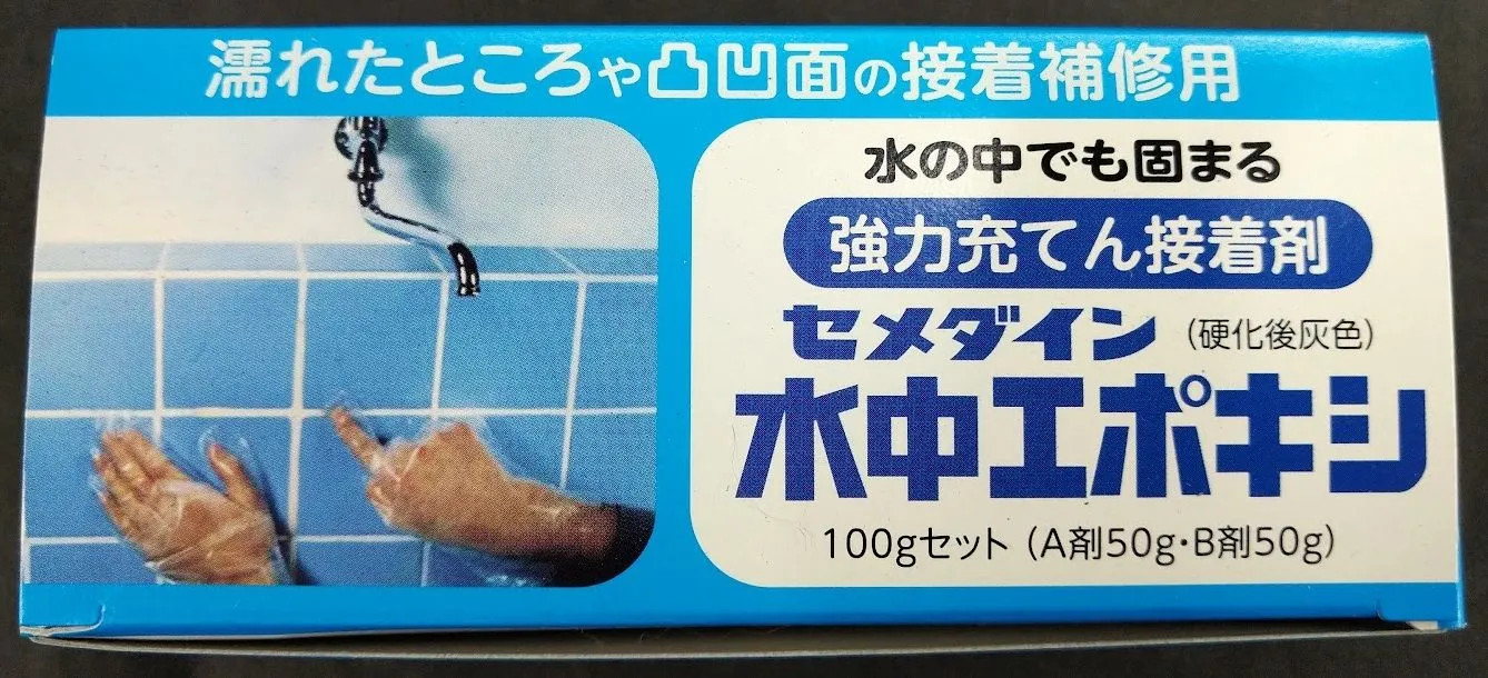 セメダイン 水中エポキシ 100gセット CA-152 1セット 用途 湿潤面(乾燥できないところ)や凸凹面の接着・補修。 機能・特徴 耐水性・耐熱性に優れています。 水の中でも固まります。 仕様