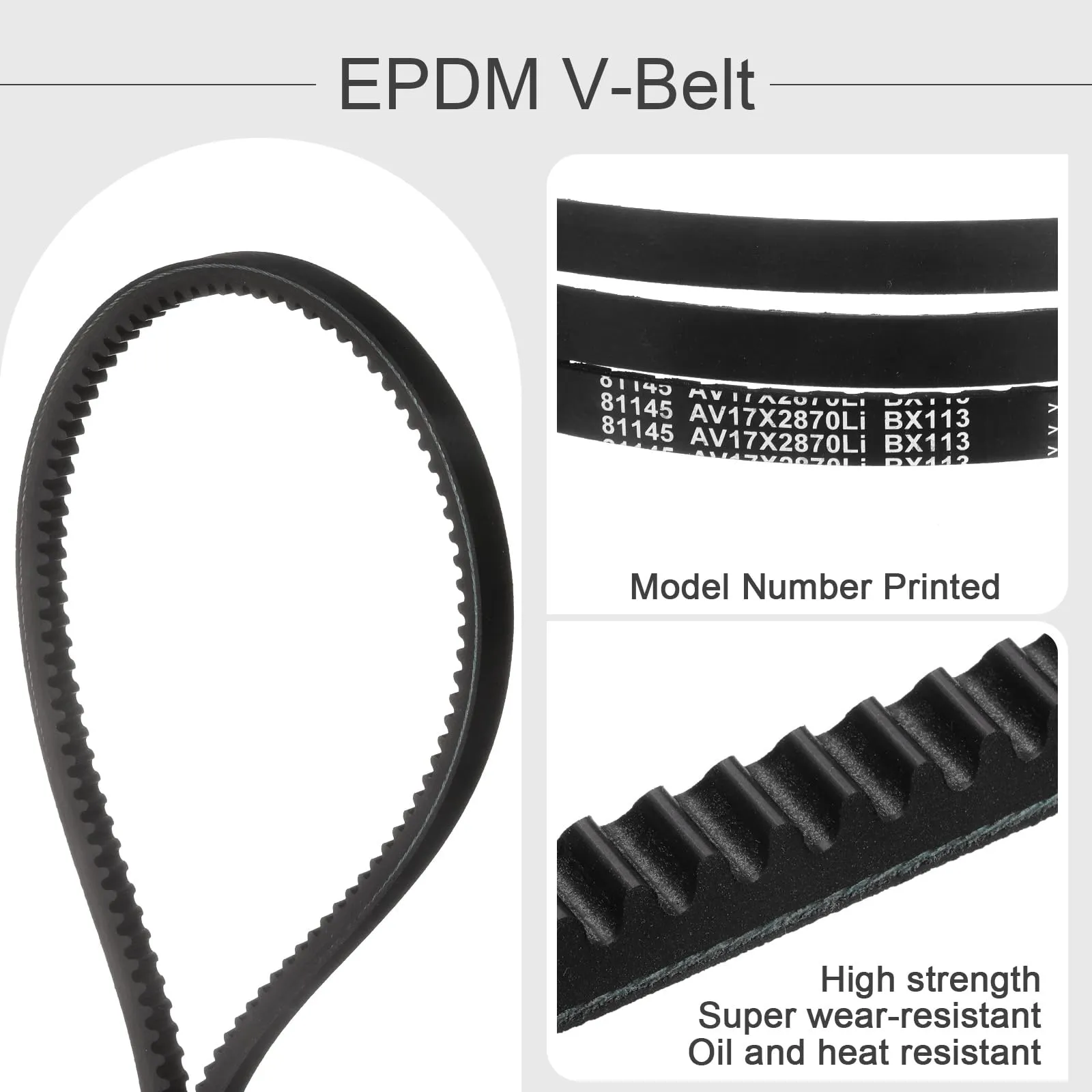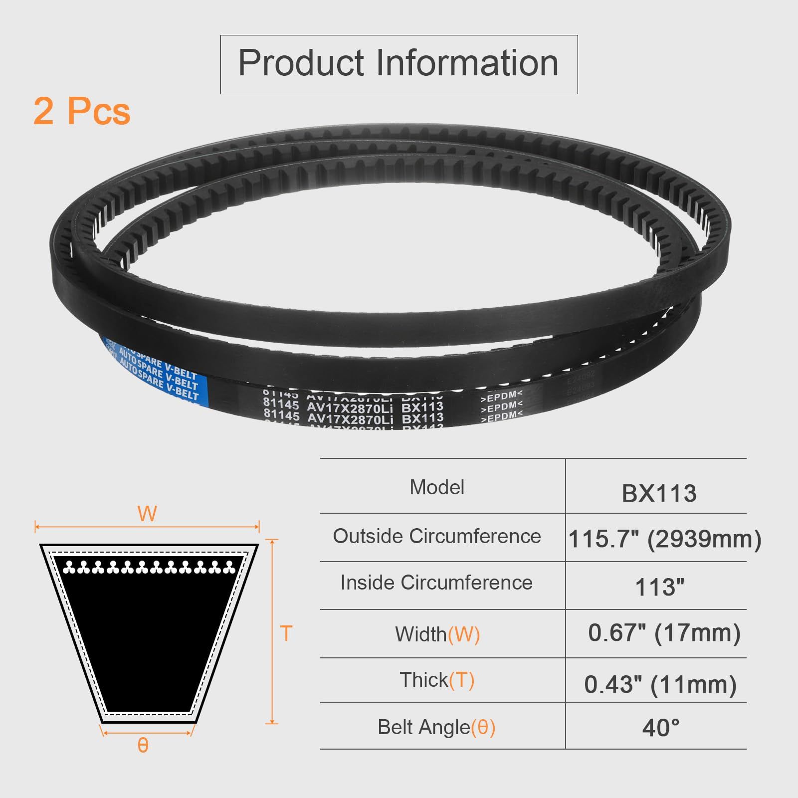 サイズ - BX113 クラシックコグ V ベルト、内周: 113 インチ、外周: 115.7 インチ (2939mm)、幅: 0.67 インチ (17mm)、厚さ: 0.43 インチ (11mm)
