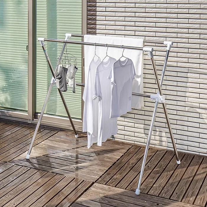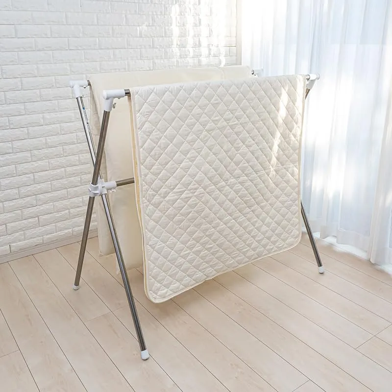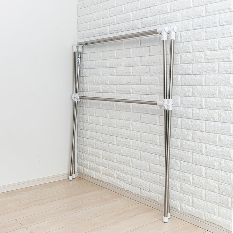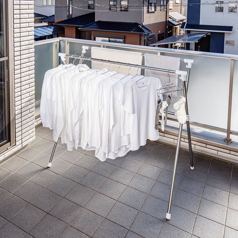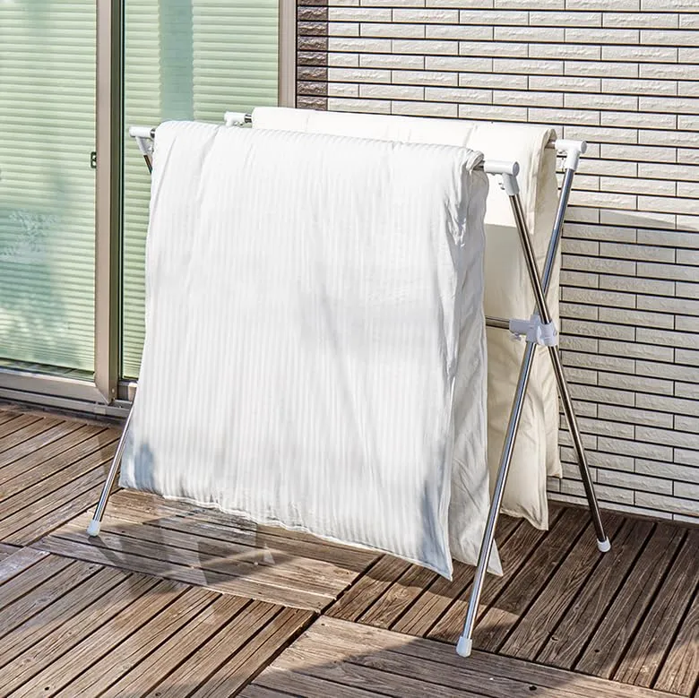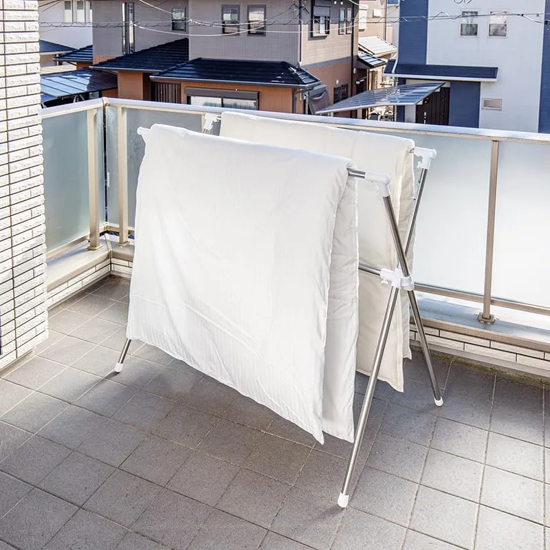 ベランダや室内でも使えるコンパクトサイズのふとんほし。収納は幅約8cmとスリムに収納。ふとん2枚干し。耐荷重約10㎏迄。(材質)パイプ:ステンレス巻きスチールパイプ、成型部品:ABS樹脂、PP樹脂、ネジ類:スチ-ル(メッキ)