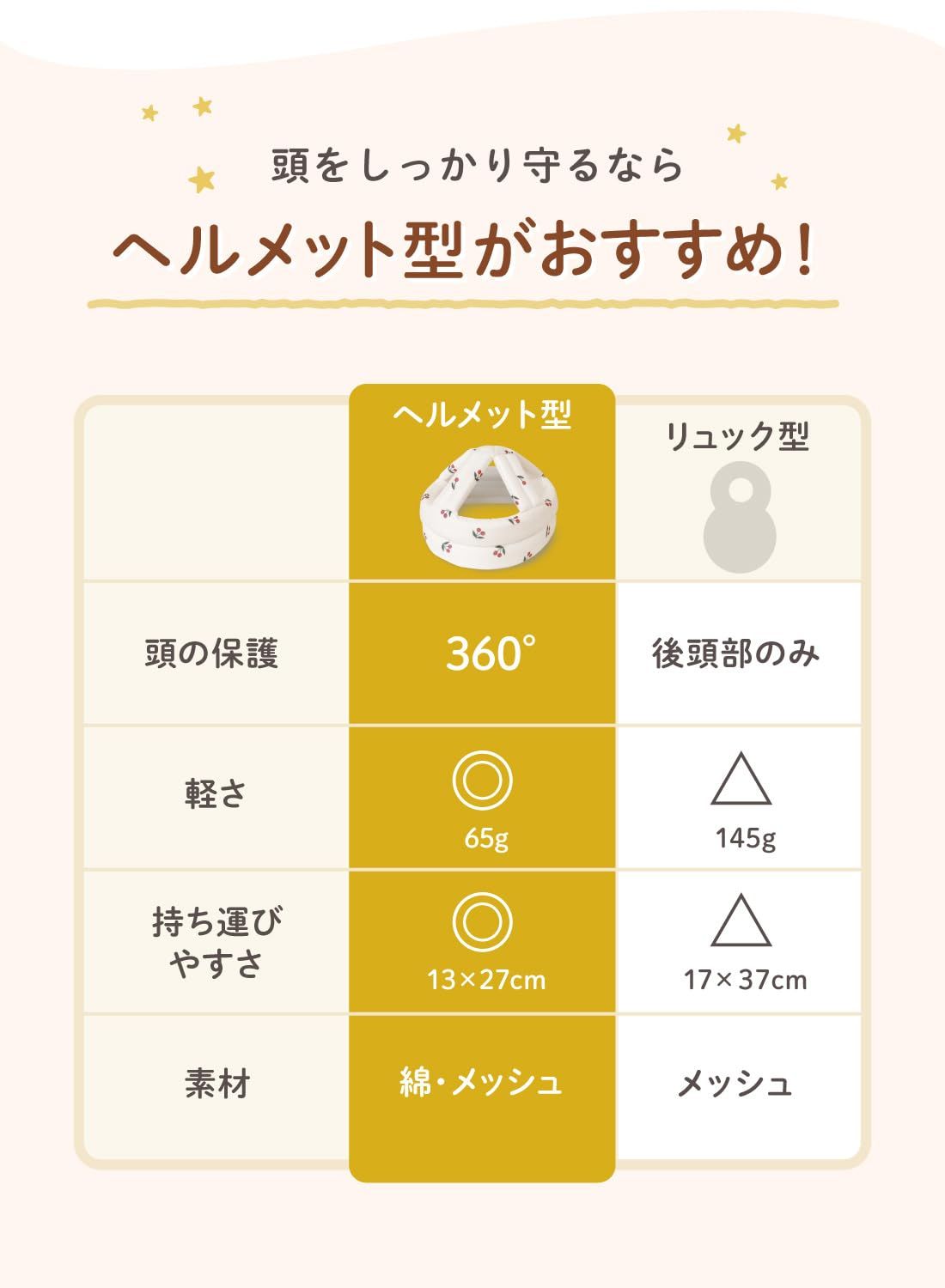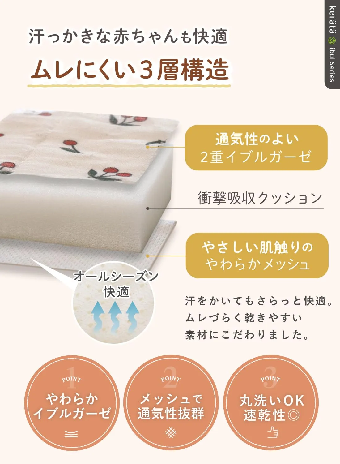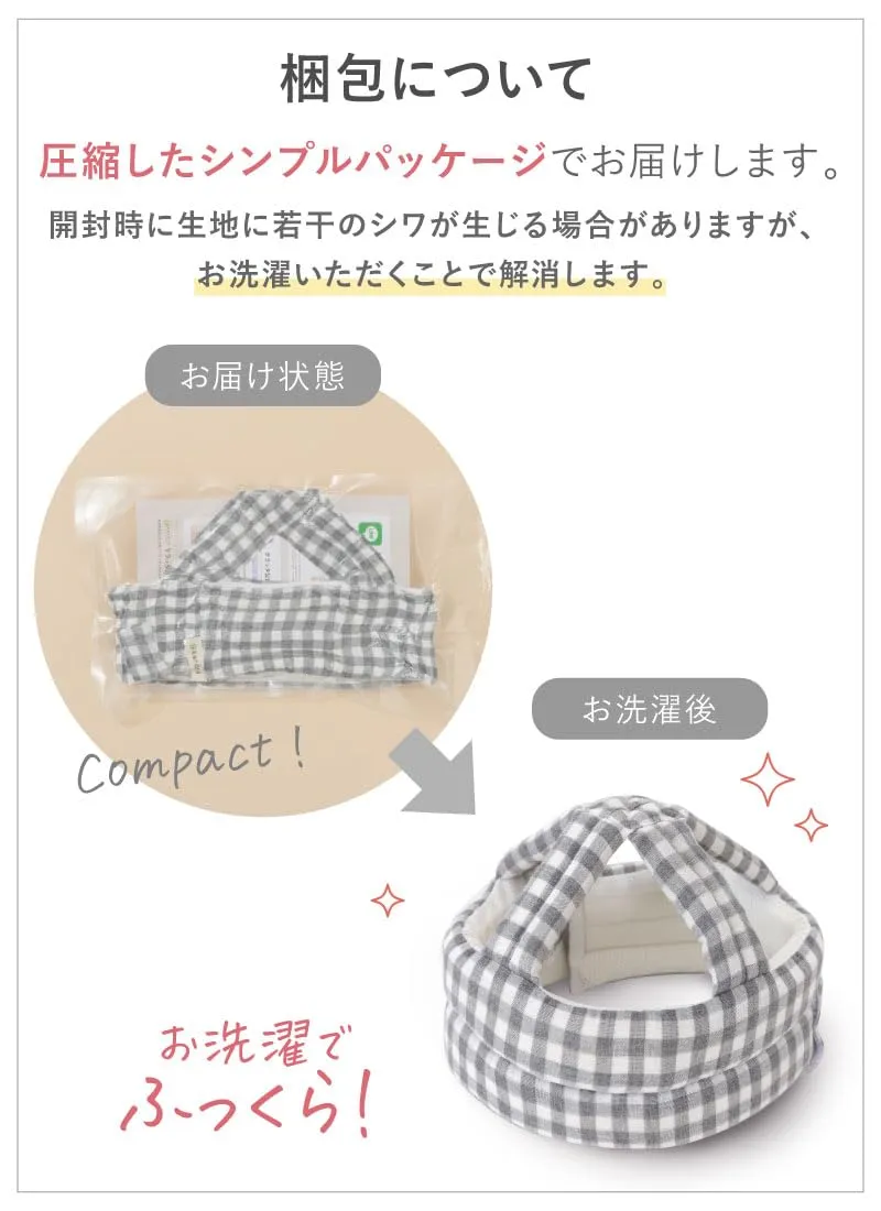 【赤ちゃんの負担にならない工夫】厚さ2cmのふかふかなクッションで万が一赤ちゃんがごっつんしても、転倒時の衝撃をやわらげます。内側には肌触りのやさしい、やわらかいメッシュがついているのでがんばり屋さんで汗っかきな赤ちゃんもムレなく、サラリと快適な着け心地です。また、イブルガーゼ素材でできているので重さはたったの65g。バランスが取れない赤ちゃん、帽子やかぶりものが苦手なお子さまへの負担を軽減します。