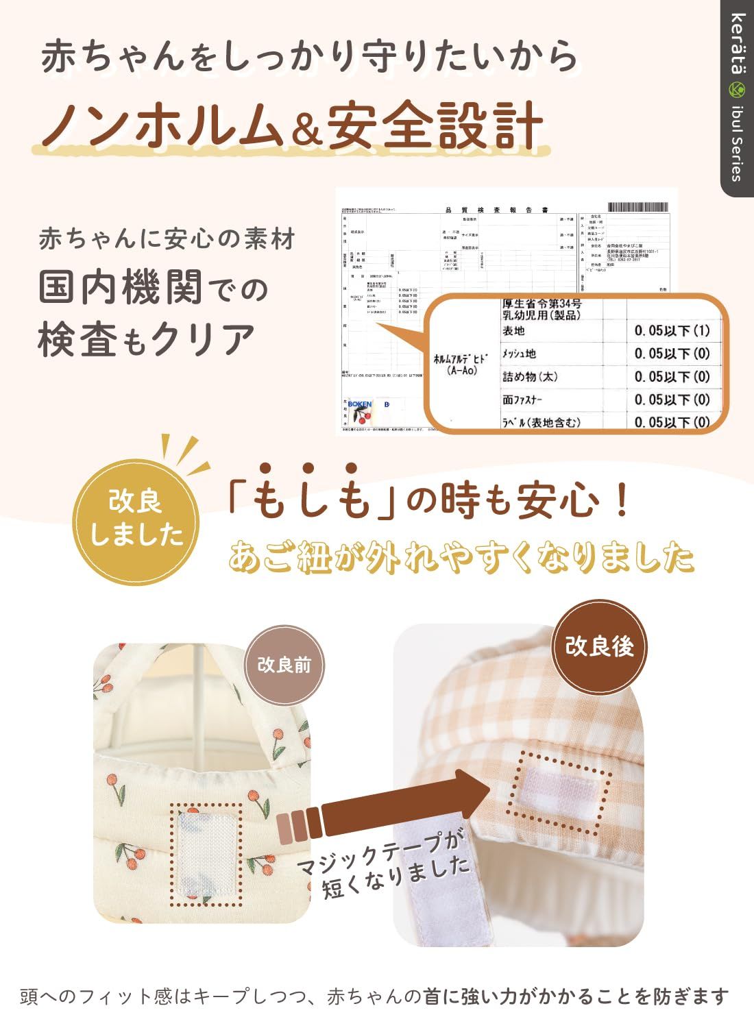 【ケラッタのイブルガーゼシリーズにベビーヘルメットが仲間入り】イブルの風合いがかわいいごっつん防止ヘルメットを作りました。いろんなことに興味津々な赤ちゃん。あちこち動き回ってはバランスを崩して転んでばかり。「いっぱい歩くのはいいことだけど、頭を打たないか心配」そんなパパママに。赤ちゃんの頭を360°やさしく包み、守ります。