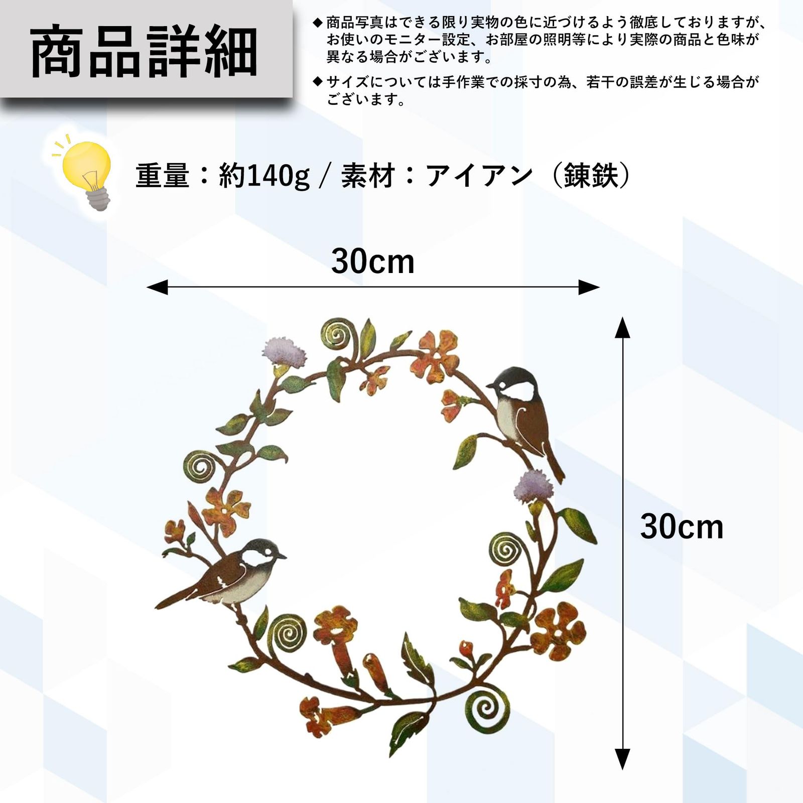 【軽やかなアイアン】約140gと軽量なため取り付けが簡単で、玄関のドアや室内の壁にも安心して飾れます。ビスでしっかり固定するだけでなく、紐で吊るすだけでも美しく映えるので、場所を選ばず気軽にレイアウト可能。「薄いけれどしっかりしている」と好評で、角度をつけたり少し浮かせて飾ることで陰影が生まれ、立体感のあるアイアンリースとして楽しめます。
