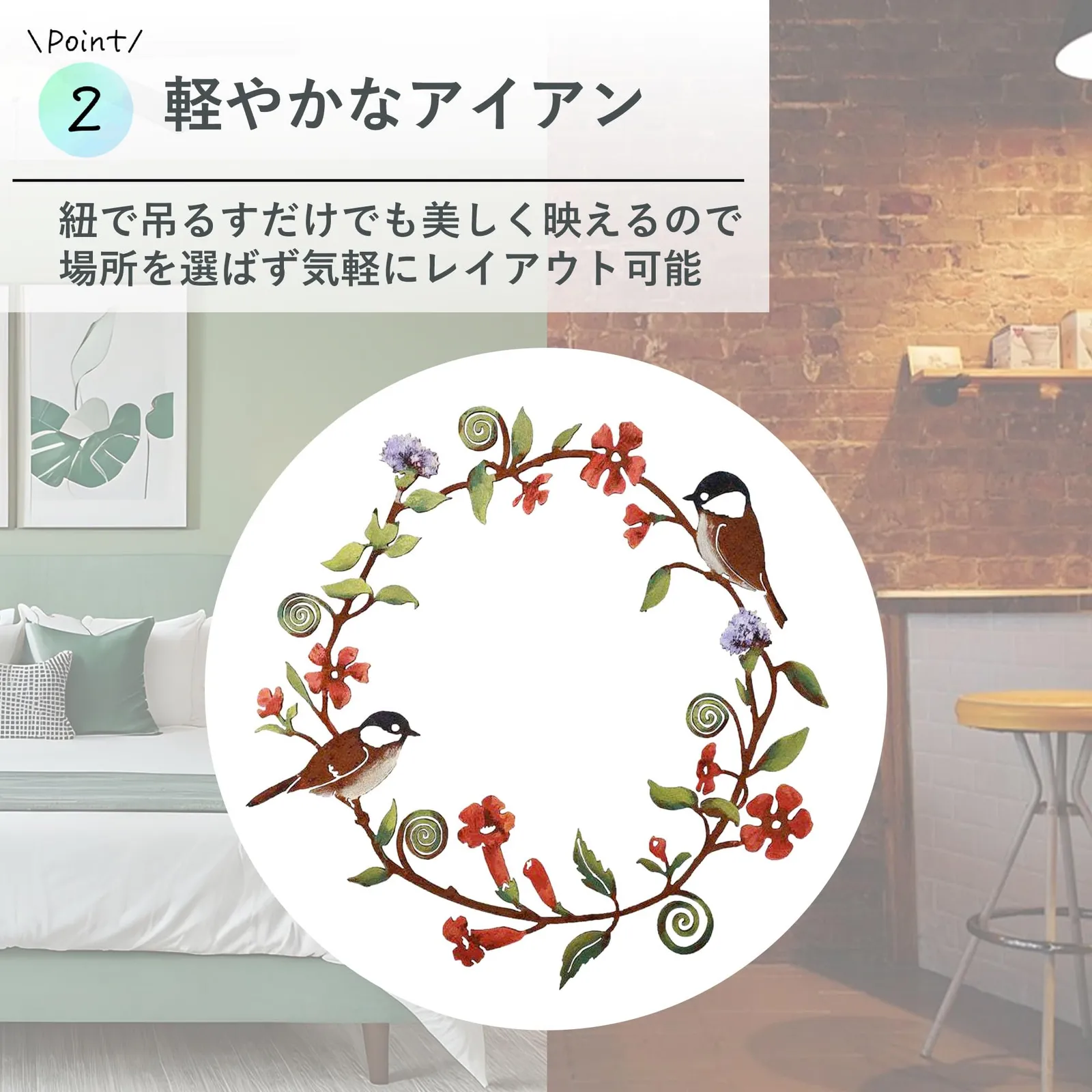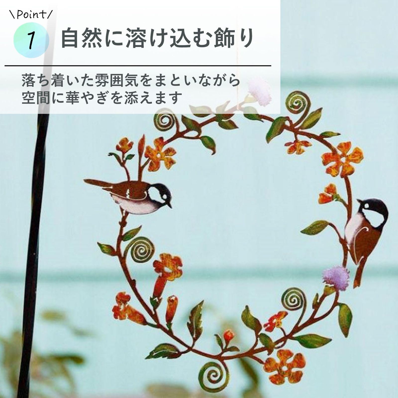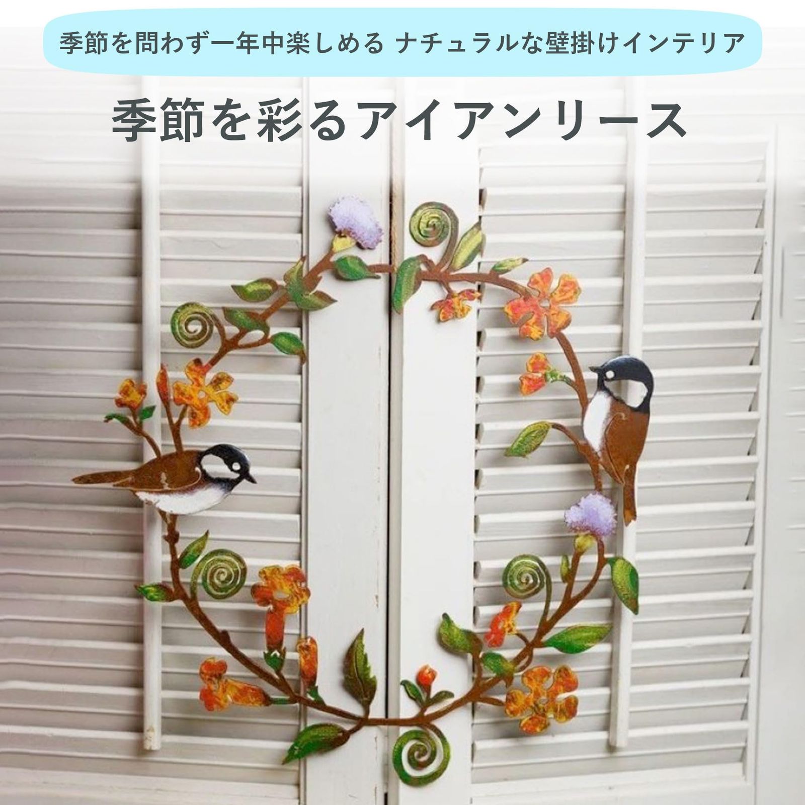 【自然に溶け込む飾り】アイアン素材に小鳥と草花の透かし模様を施したアンティーク調リース。玄関ドアやリビングの壁に飾ると、落ち着いた雰囲気をまといながら空間に華やぎを添えます。派手すぎず飽きのこないデザインは、「玄関が明るくなった」「自然な感じで癒される」と高評価をいただいています。フラワーリースの代わりに季節を問わず楽しめる、おしゃれな壁掛けインテリアです。