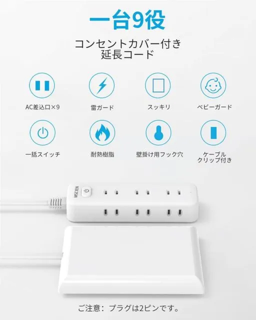 コンセントカバー付き:コンセントプラグはカバーが付いています。プラグピンを含まないカバーサイズは約148.2×95.2×19.5です。※ご注意:2Mの延長コードにはケーブルクリップが付いていません。ほかの延長コードにはケーブルクリップが付いています。カバーの深さは約19.5ですから、壁コンセントと本製品のサイズが異なる場合は、本製品を挿入する際にカバーと壁コンセントの間に少し隙間があります。プラグは2ピンです。購入前にカバーサイズとプラグ仕様をご確認くださいませ。