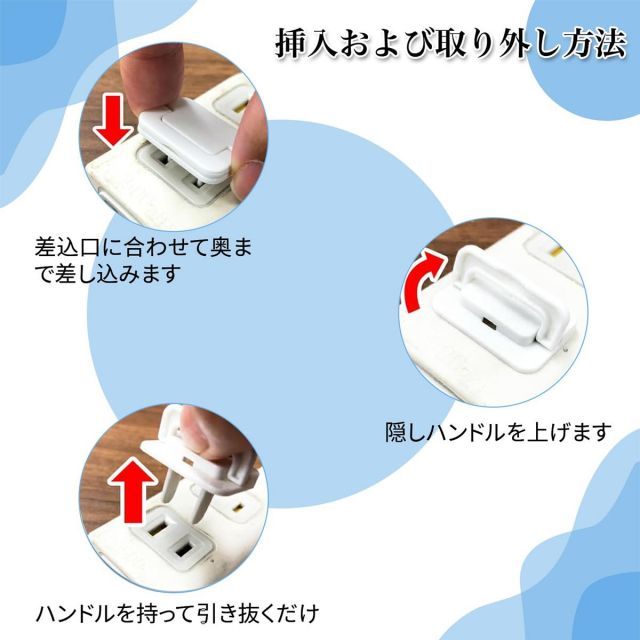 【隠しハンドル設計】このソケットカバーは隠しハンドル設計なので、ソケットに差し込むだけで取り付けが簡単です。大人でも使いやすいですが、開けにくいので赤ちゃんにも安心です。