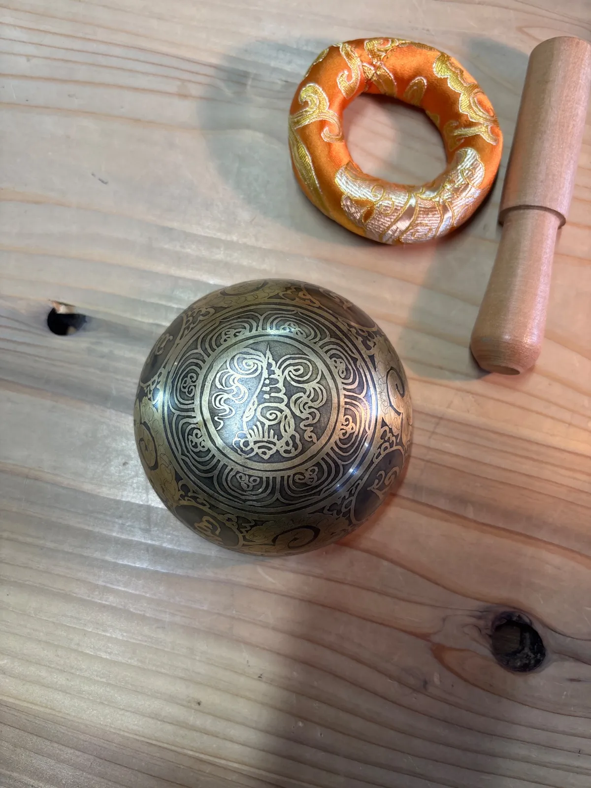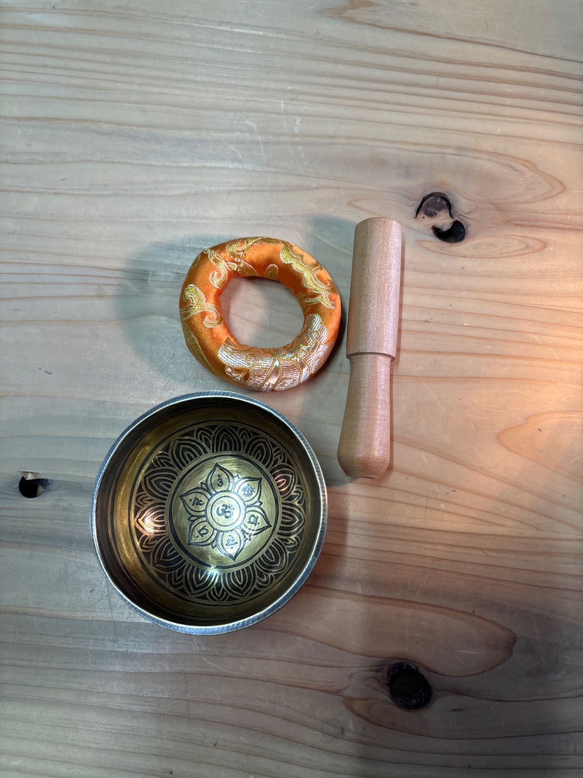 ネパールで製作したハンドメイドのシンギングボウルです。 パワーストーンの浄化、勾玉浄化、空間浄化、浄化、ヨガ、瞑想に! ハンドメイドのシンギングボウルなので、機械造りのモノと違い柔らかく優しい倍音です。 サイズや重さは写真に載せておりますのでご確認ください。 他にも色々なデザインも出品しております。 付属品は写真にアップしているモノが全てになります。 ★このシンギングボウルはハンドメイドで機械造りではございません。
