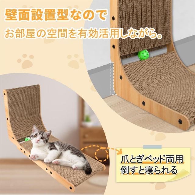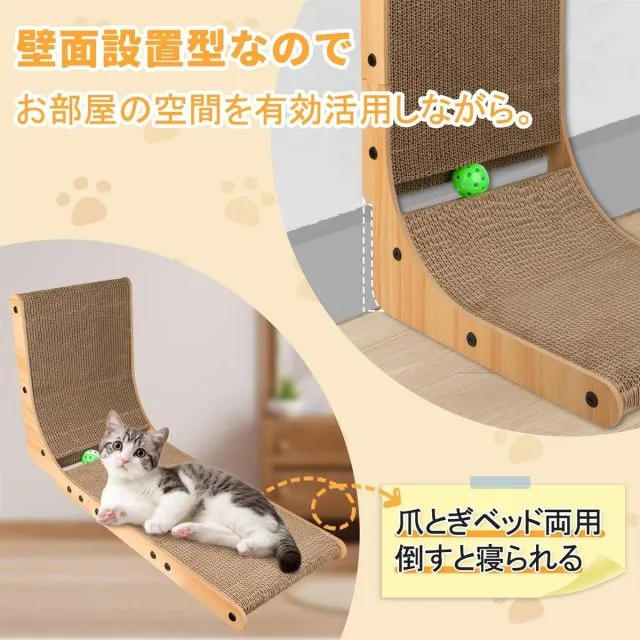 【省スペース】壁面設置型なので、お部屋の空間を有効活用しながら、猫ちゃんの運動不足やストレス解消に役立ちます。長い方を下にして置けば、猫ちゃんのくつろぎスペースにもなります。