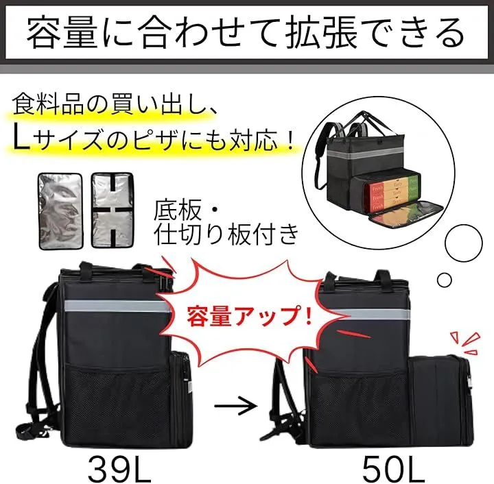 ピザや寿司など大判料理はもちろん、スーパーでの買い出しやキャンプ用の食材運搬にも対応可能。