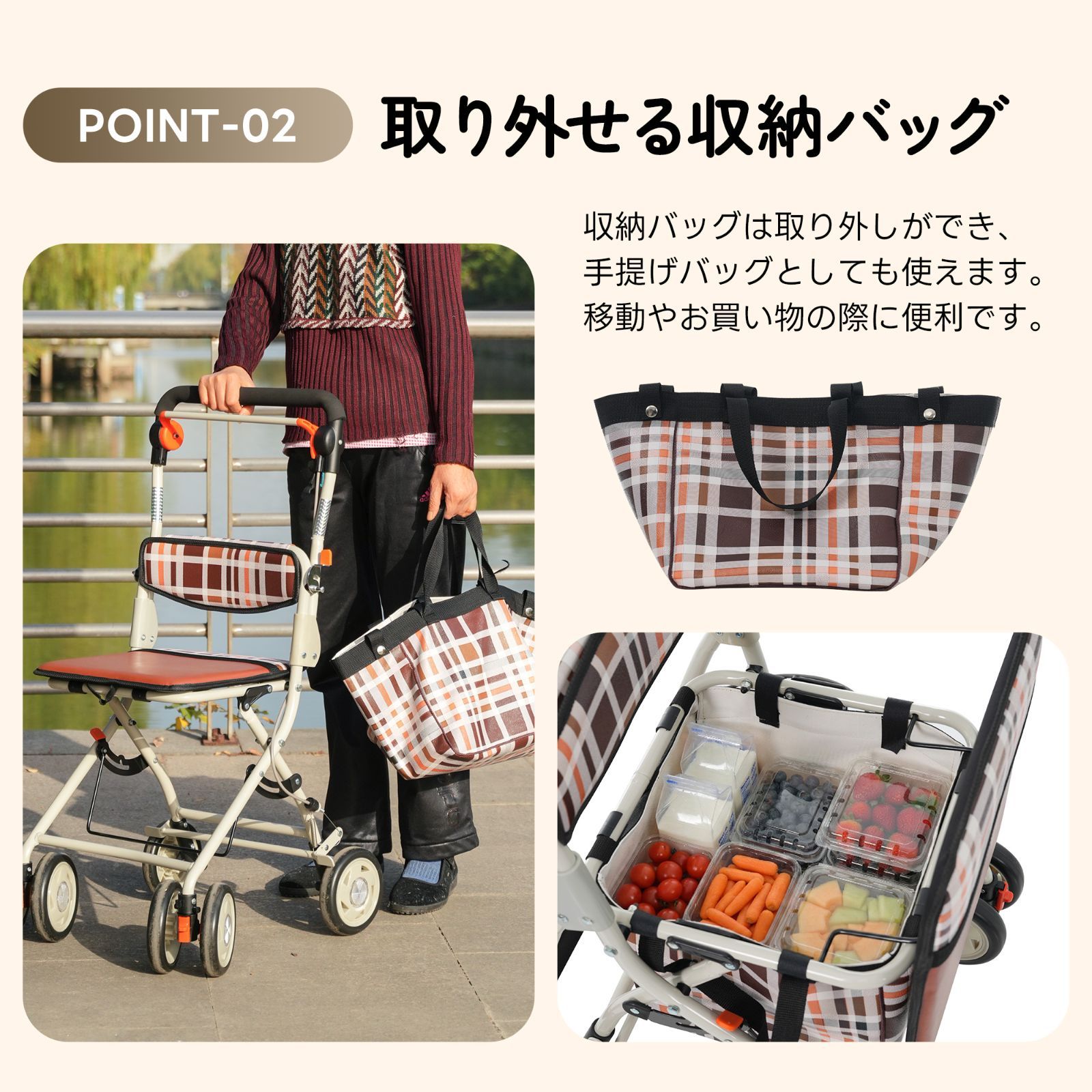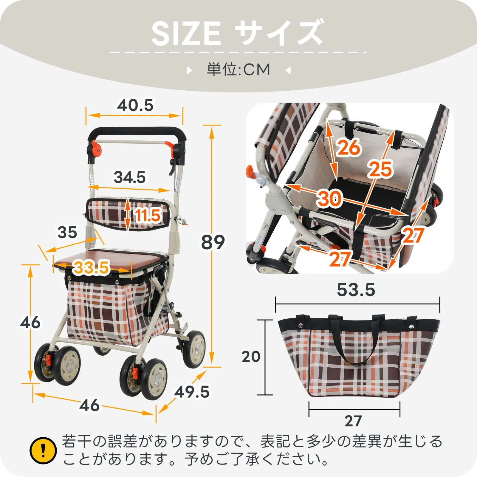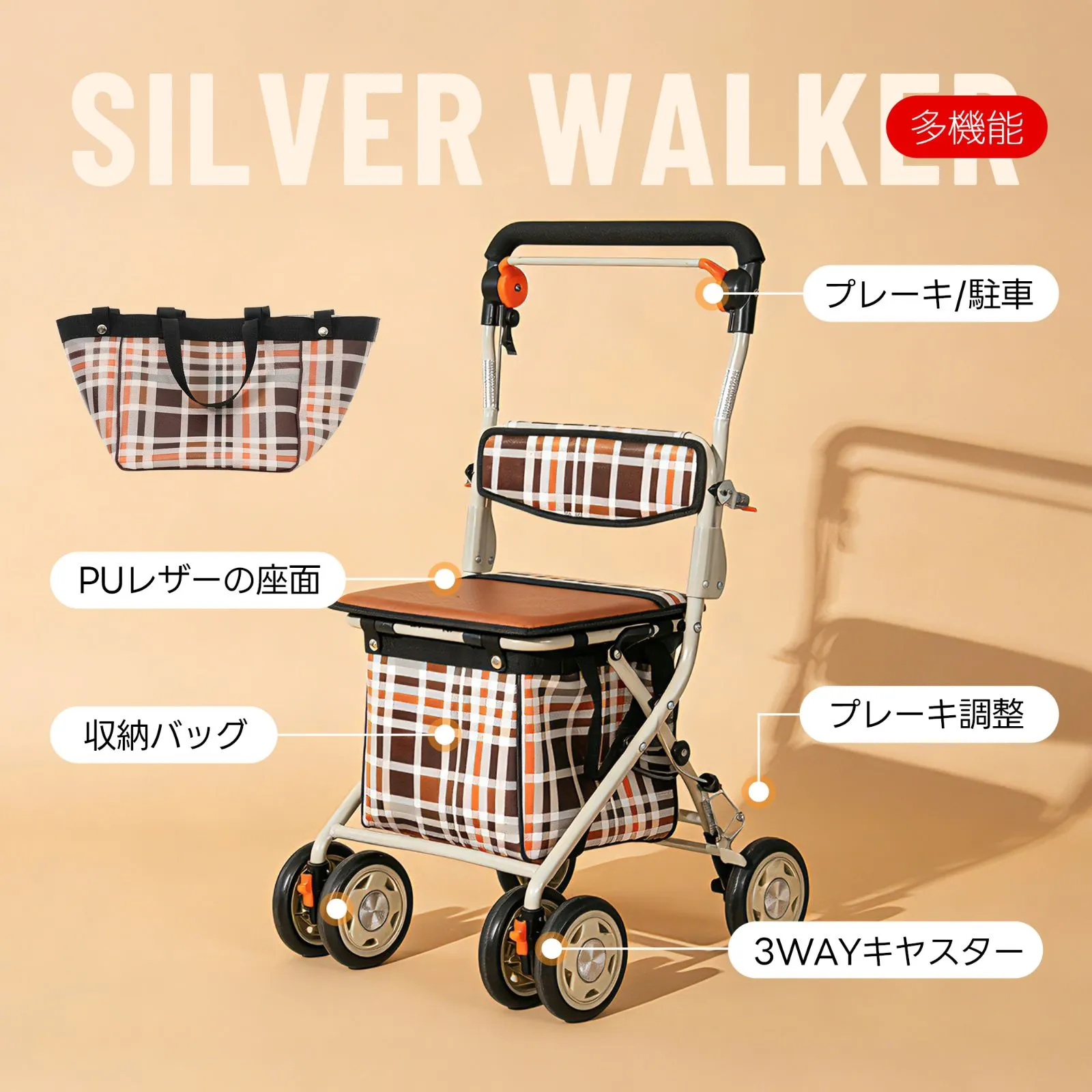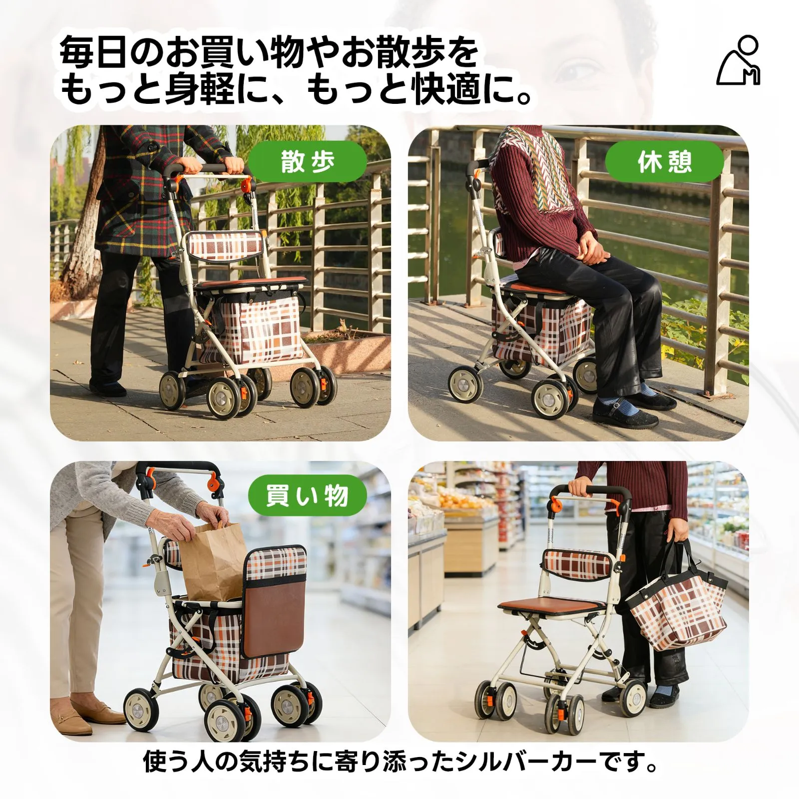 シルバーカー 歩行器 歩行車 室外用 6段階高さ調整 折りたたみ可能 座面付き 四輪 キャスター付き おしゃれ 座れる 散歩 シニア 歩行補助 買い物 ショッピングカー 大容量 老人車 手押し車 介護 高齢者