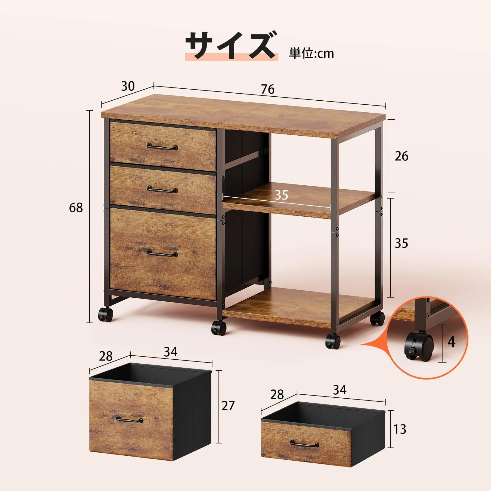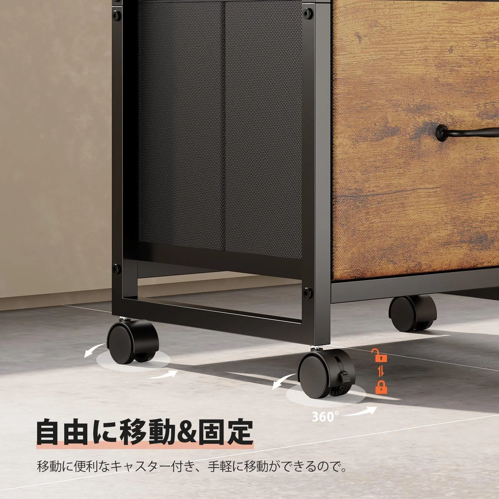 【移動便利】引き出しの取材がオックスフォード布と不織布なので、サイドワゴン全体がとても軽く、移働に便利なキャスターがついています。手軽に移動ができますので、レイアウトの変更や掃除の際も簡単に移動ができます。また、ストッパーが付いているので、引出しを開ける度にワゴンが一緒に動いてしまったり、転倒したりすることはありません。