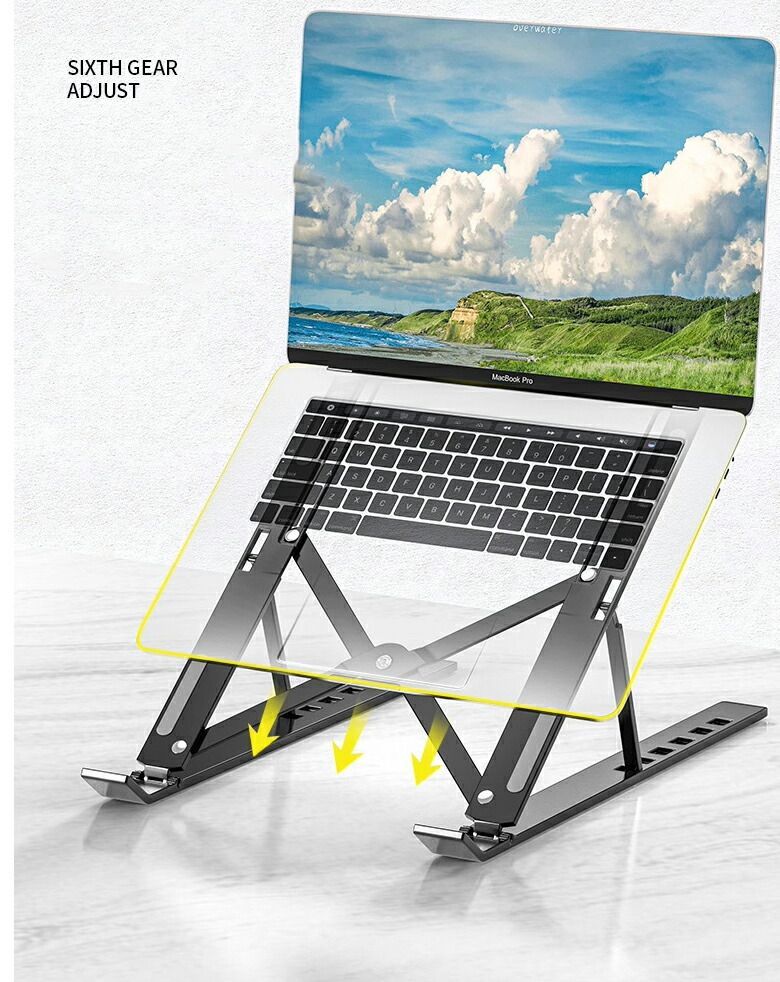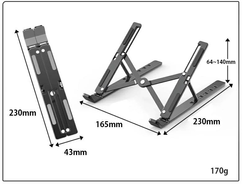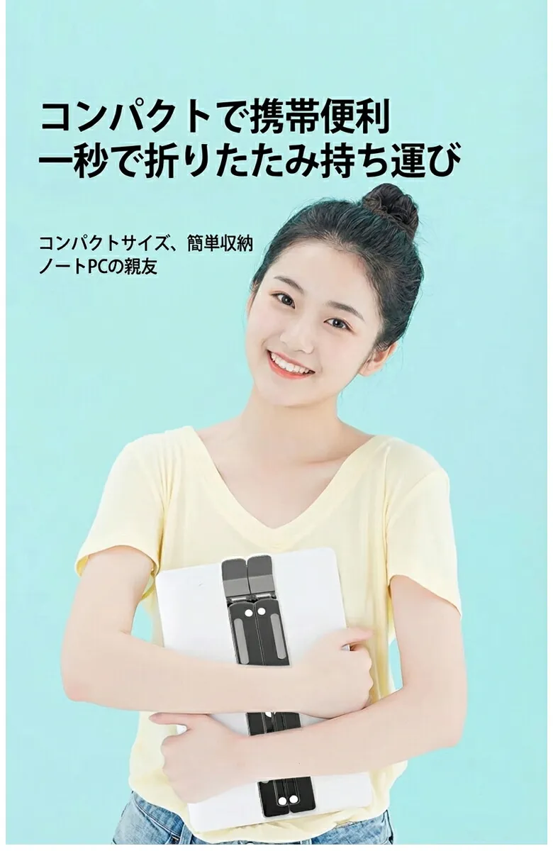 折りたたみ式ノートパソコンスタンド。樹脂製で軽く、コンパクトに収納。