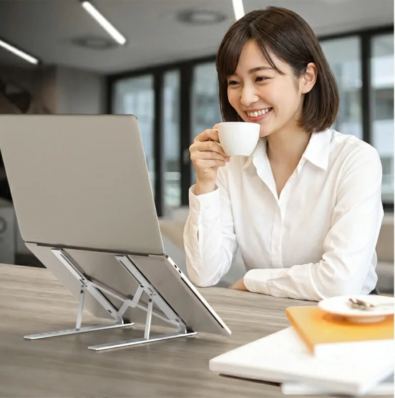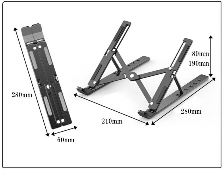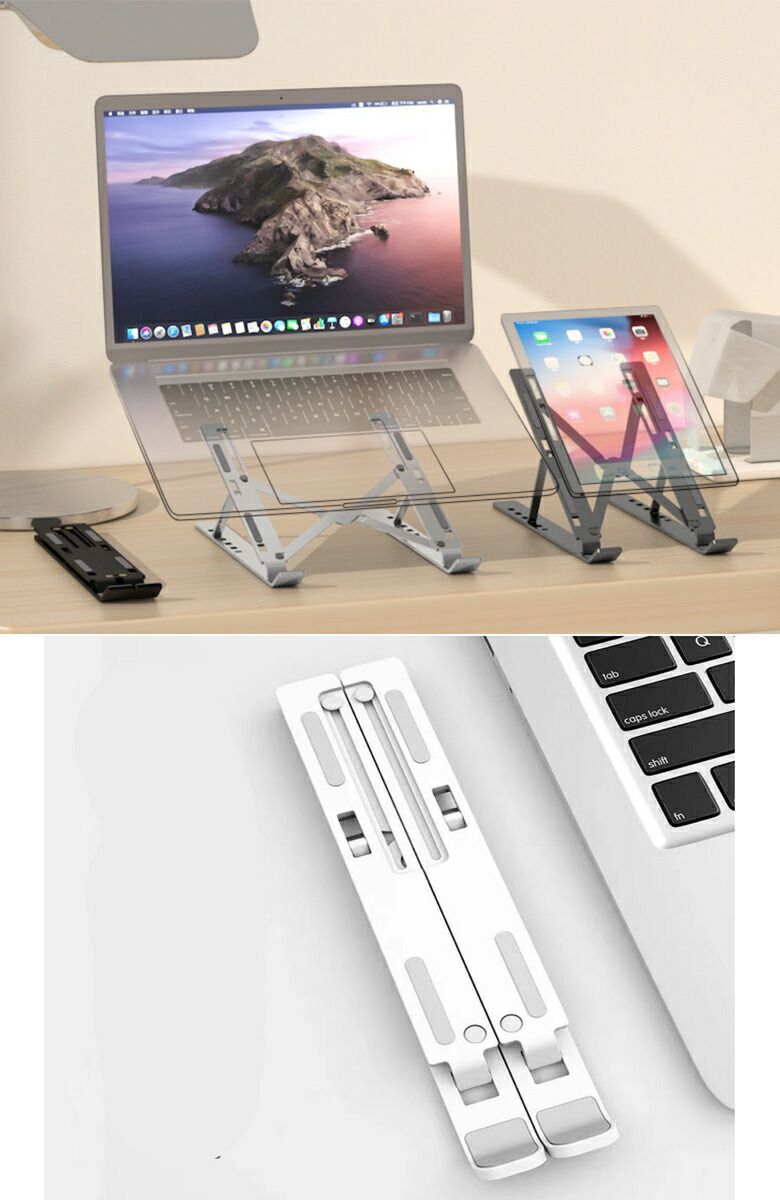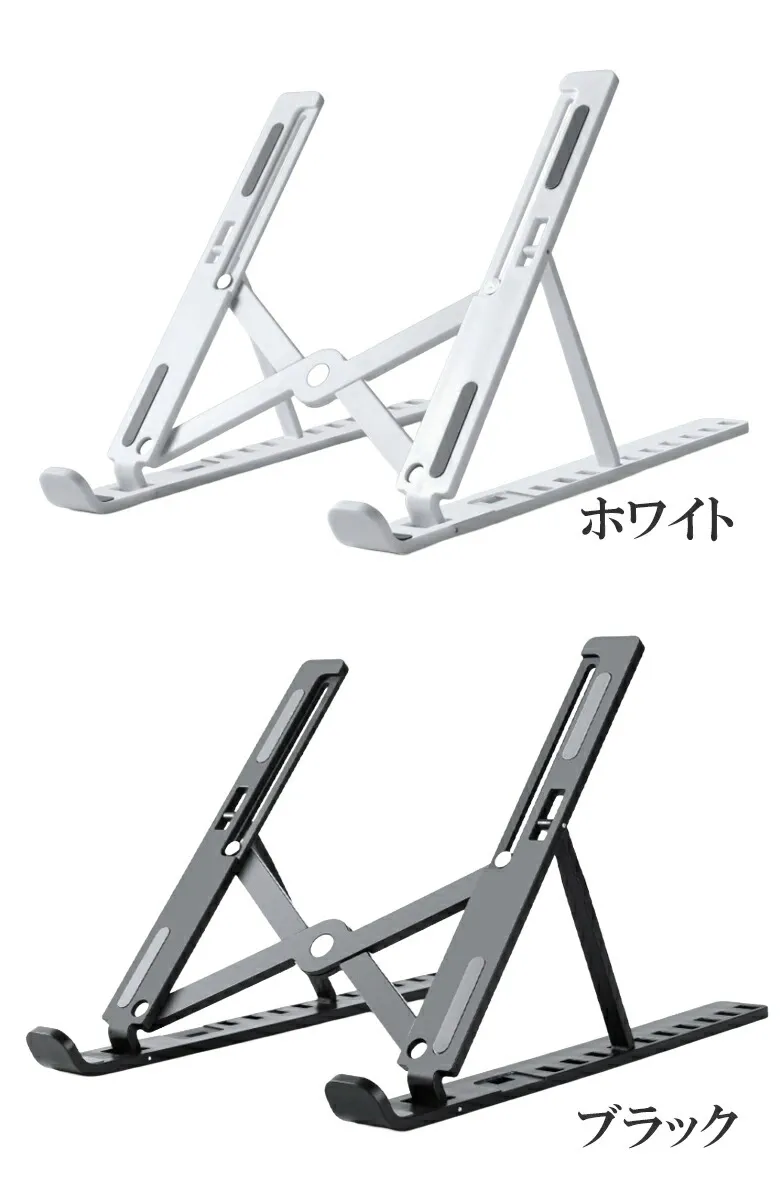 折りたたみ式ノートパソコンスタンド。樹脂製で軽く、コンパクトに収納。