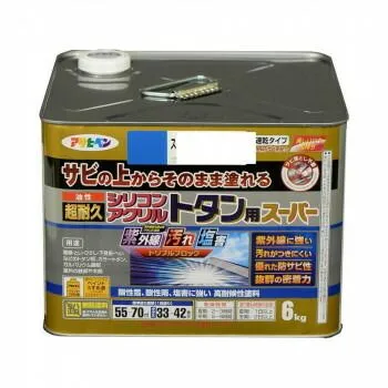 サビの上から直接塗れる、トタン用の光沢塗料です。1回塗りで仕上がりますので作業性が抜群です。特殊強力防サビ剤がサビの進行を抑え、長期間素材をサビから保護します。紫外線劣化防止剤を配合していますので、長期間高光沢を維持し、耐候性が格段に優れています。