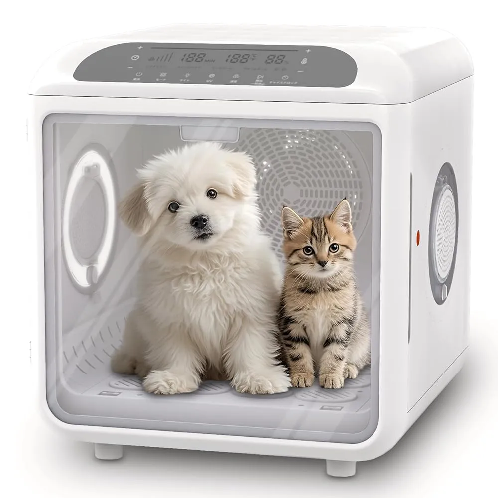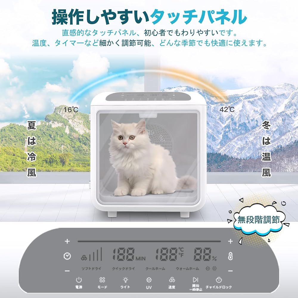「初心者でもわかる」直感的なタッチパネルを通して独自のモードをカスタマイズすることができ、細かな設定温度16~42℃、風量は4段階 、 6つのモード、 ライトは3段階、タイミング、ロックなど、季節やペットの好みに応じて細かく調整できます。温度は±0.1℃の精度で管理され、すぐに暖まるから濡れたペットも寒くない! 暑い夏場は送風モードでさわやかに。両側の窓を取り外していただくと、乾燥機としてだけではなく、心地よいペットハウスとしてもお使いいただけます。