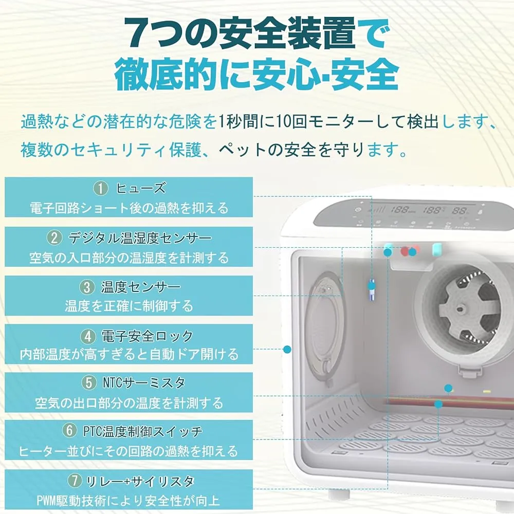 「快適と安心の両立」高い安全性と乾燥効率により、ペットの不安感を軽減します。高精度センサーでリアルタイムの温度監視により、異常温度が検知されると即座に動作を自動停止。ペットが常に安全で快適な環境で過ごせるよう設計されています。低ノイズ、測定値は 35dB~50dBです。ペットが怖がることが無いよう、図書館と同じくらい静音です。※一般的なドライャー約80-100dB。また、両侧に設けられた「ナデナデ窓」を通じて、乾燥中にペットをなでて安心させたり、乾き具合を確認することができます。マイナスイオンが縮れや飛び散りを防ぎ、サロン帰りのような仕上がりを実現、可愛いペットに非常に滑らかな外観を提供します。