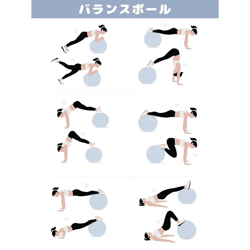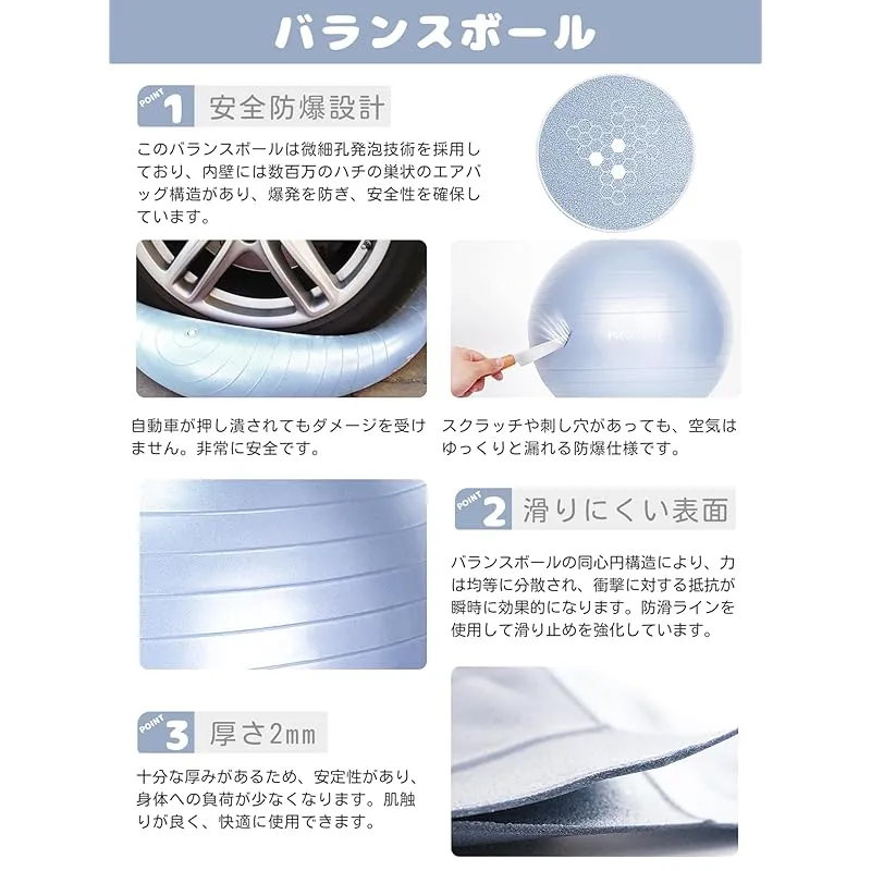 【多目的利用】 バランスボールは、楽しみながらエクササイズできる道具として人気があります。オフィスチェアとして姿勢改善に、ヨガやピラティスのトレーニングボールとしても活用できます。また、リハビリや回復、産後ケアにも役立ち、ストレス軽減や心身の健康促進に寄与します。