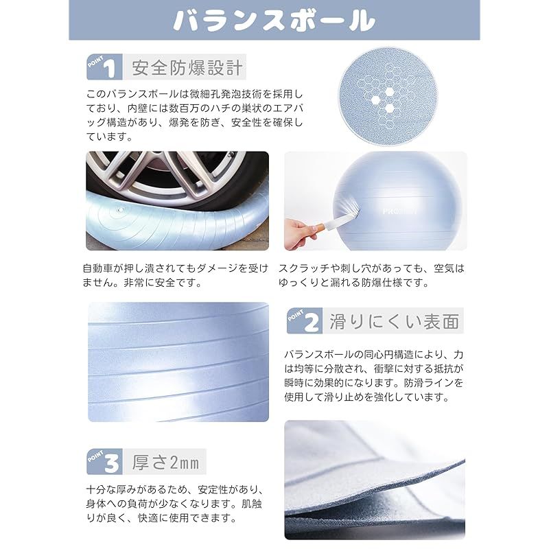 【SGS認証取得】 バランスボールは3サイズ(55cm: 1kg、65cm: 1.2kg、75cm: 1.4kg)があり、ほとんどの市場の製品よりも重く設計されています。荷重耐性は300kgで、滑り止め機能と真の爆発防止性を備え、安全にご使用いただけます。