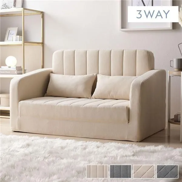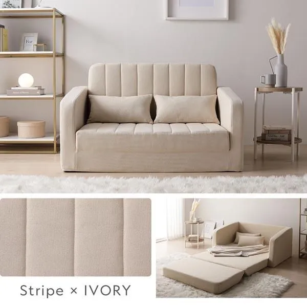 商品名:3WAY ソファベッド 2人掛け アイボリー ストライプキルト 肘付き 高反発ウレタン 体圧分散 寝具 リビング インテリア雑貨 組立品