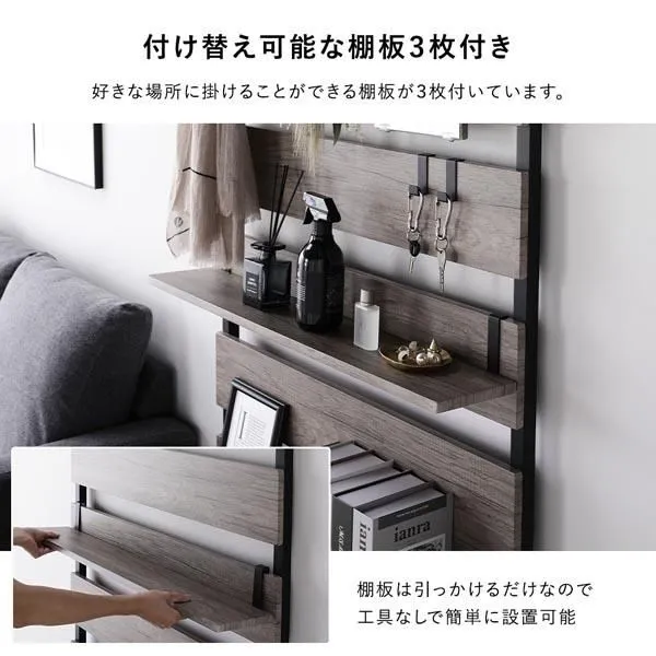 商品名:突っ張り ウォールラック 〔 45cm幅 ストーン×ブラック 〕 ミラー付き 壁面収納 棚 賃貸OK 組立品