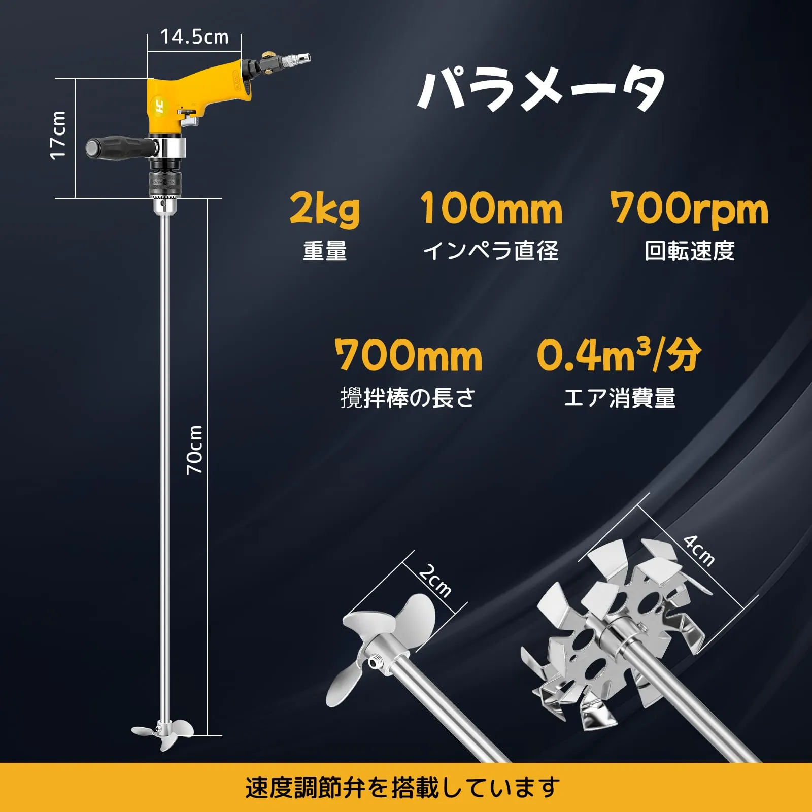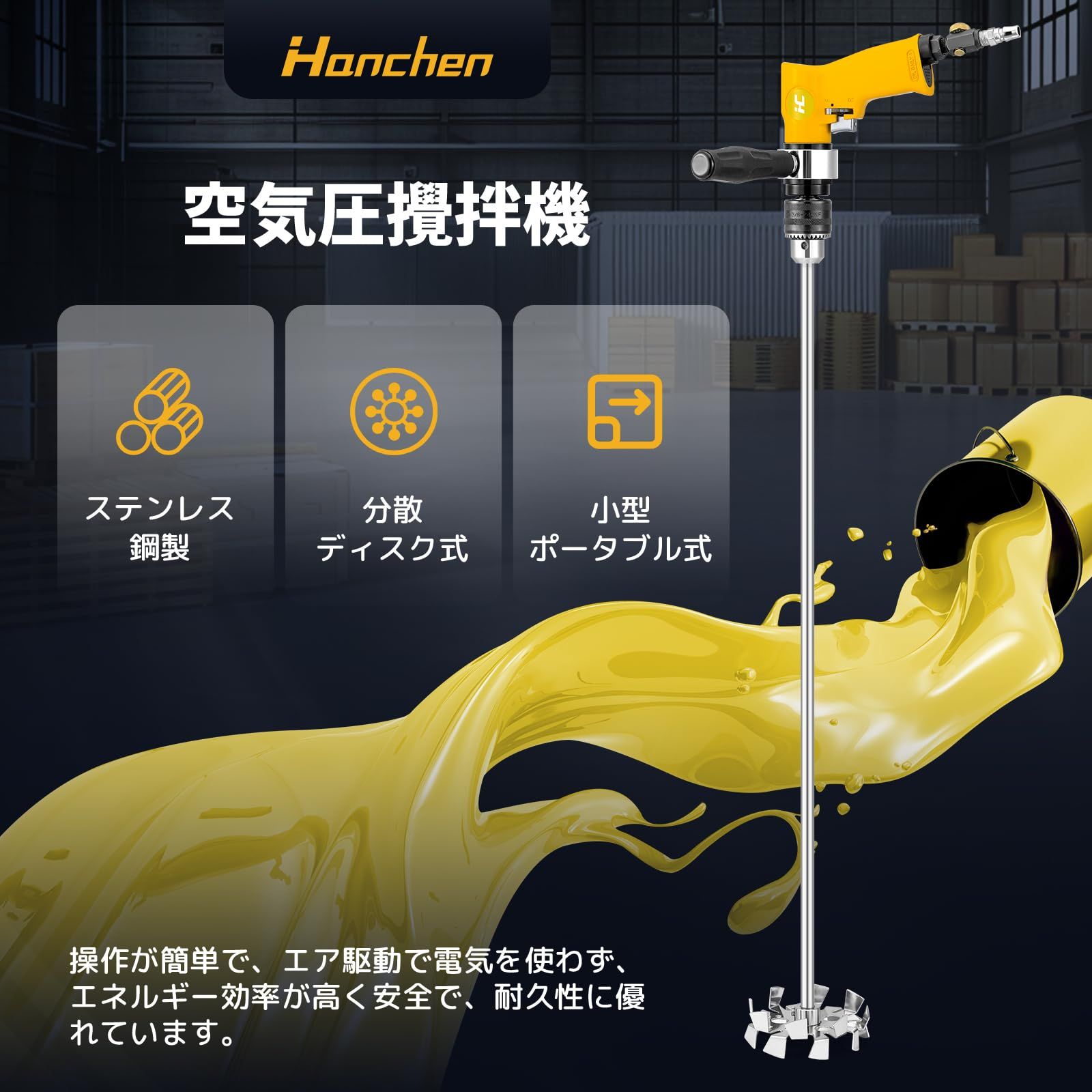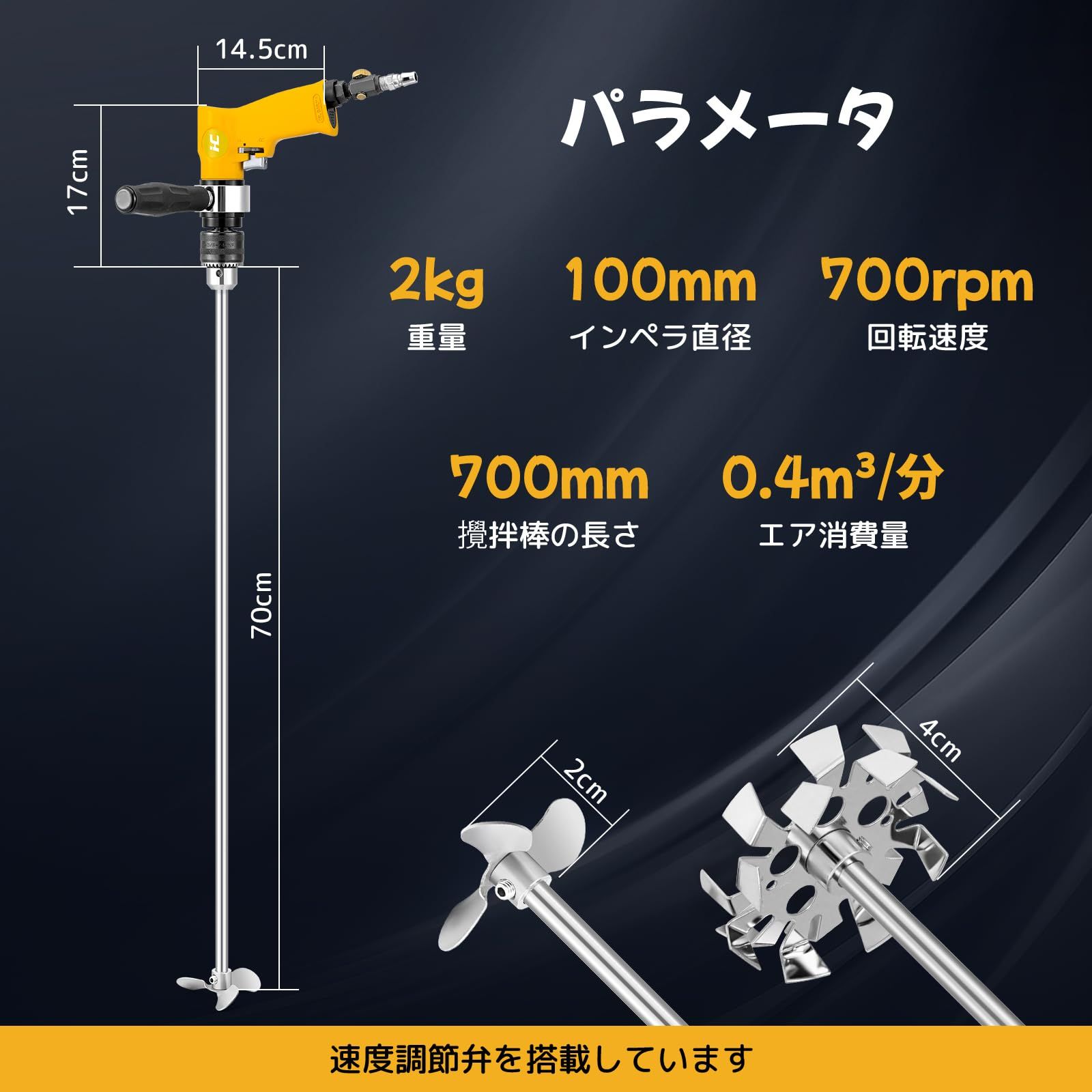 【効率的な作業】空气:6.3kg、速度:2000rpm/分選択可能、電力タイプ:空気式。50Lの材料混合できます。エアースターラーは、電気不要のエアコンプレッサーを動力源とし、強力なエアモーターがスターラーに連続的な動力を供給します。ミキシング時間を50~80%短縮されます。起動と停止が速く、負荷をかけて起動できます。電動ミキサーのように燃え尽きて使用に影響を与えることはありません。