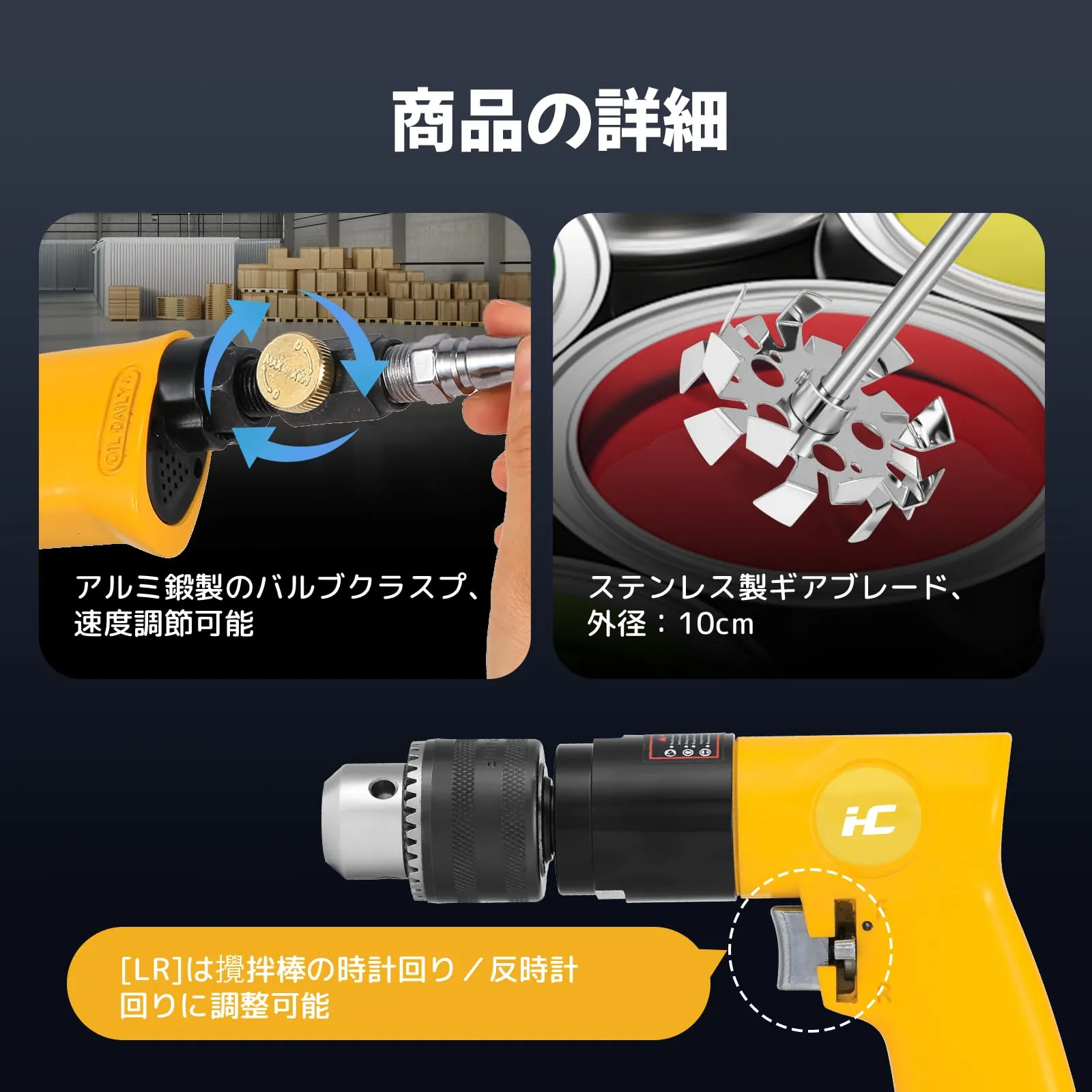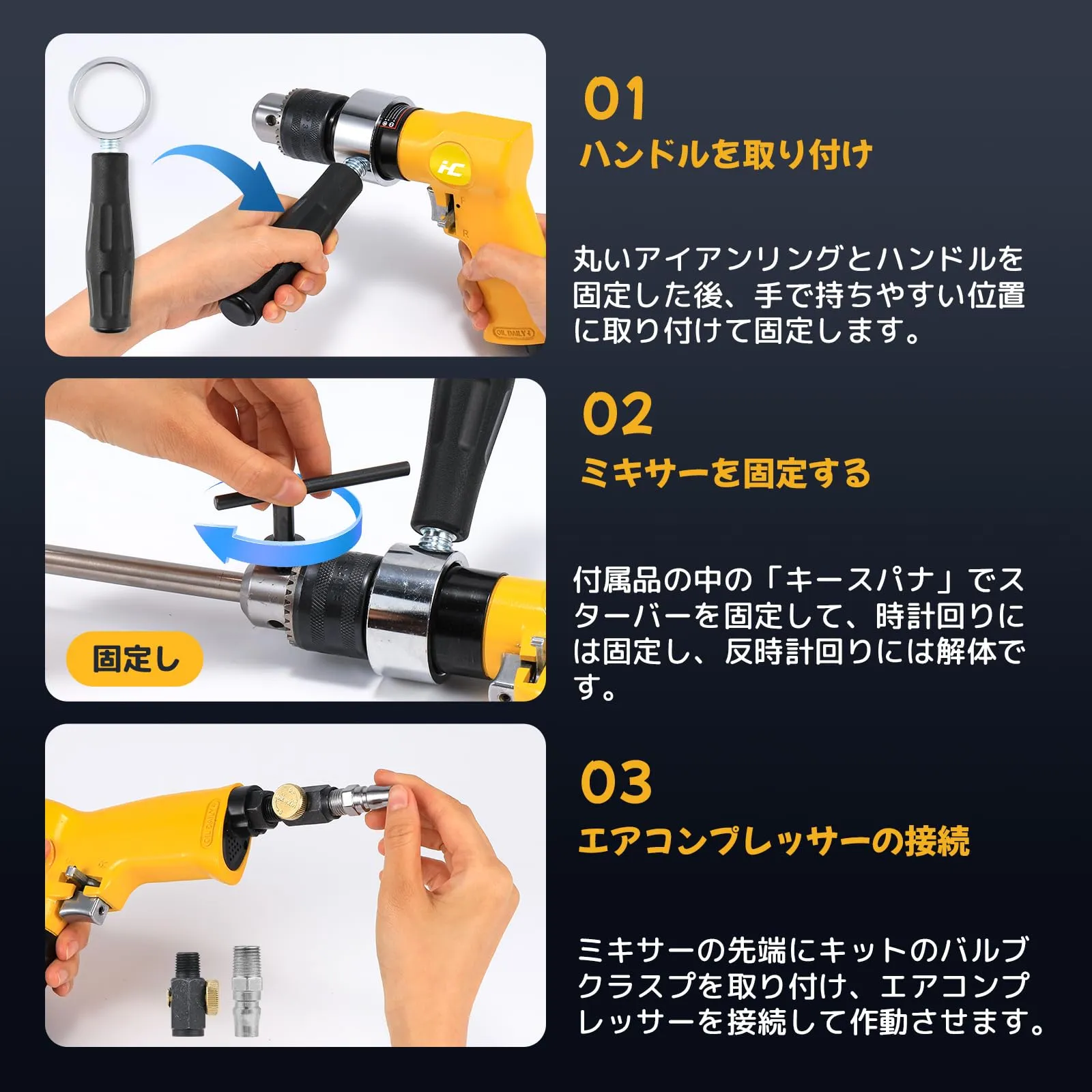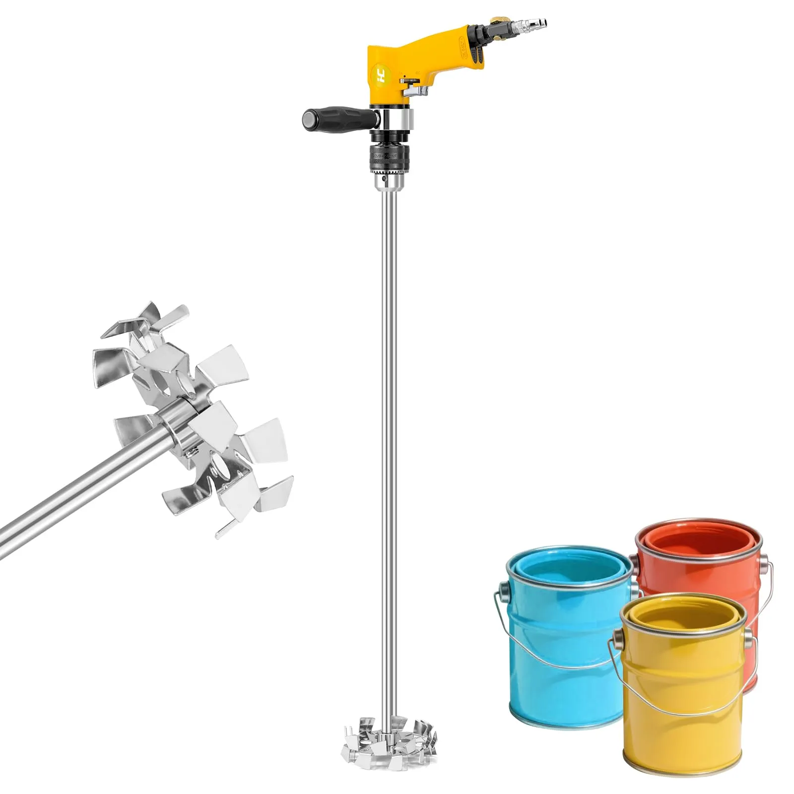 【効率的な作業】空气:6.3kg、速度:2000rpm/分選択可能、電力タイプ:空気式。50Lの材料混合できます。エアースターラーは、電気不要のエアコンプレッサーを動力源とし、強力なエアモーターがスターラーに連続的な動力を供給します。ミキシング時間を50~80%短縮されます。起動と停止が速く、負荷をかけて起動できます。電動ミキサーのように燃え尽きて使用に影響を与えることはありません。