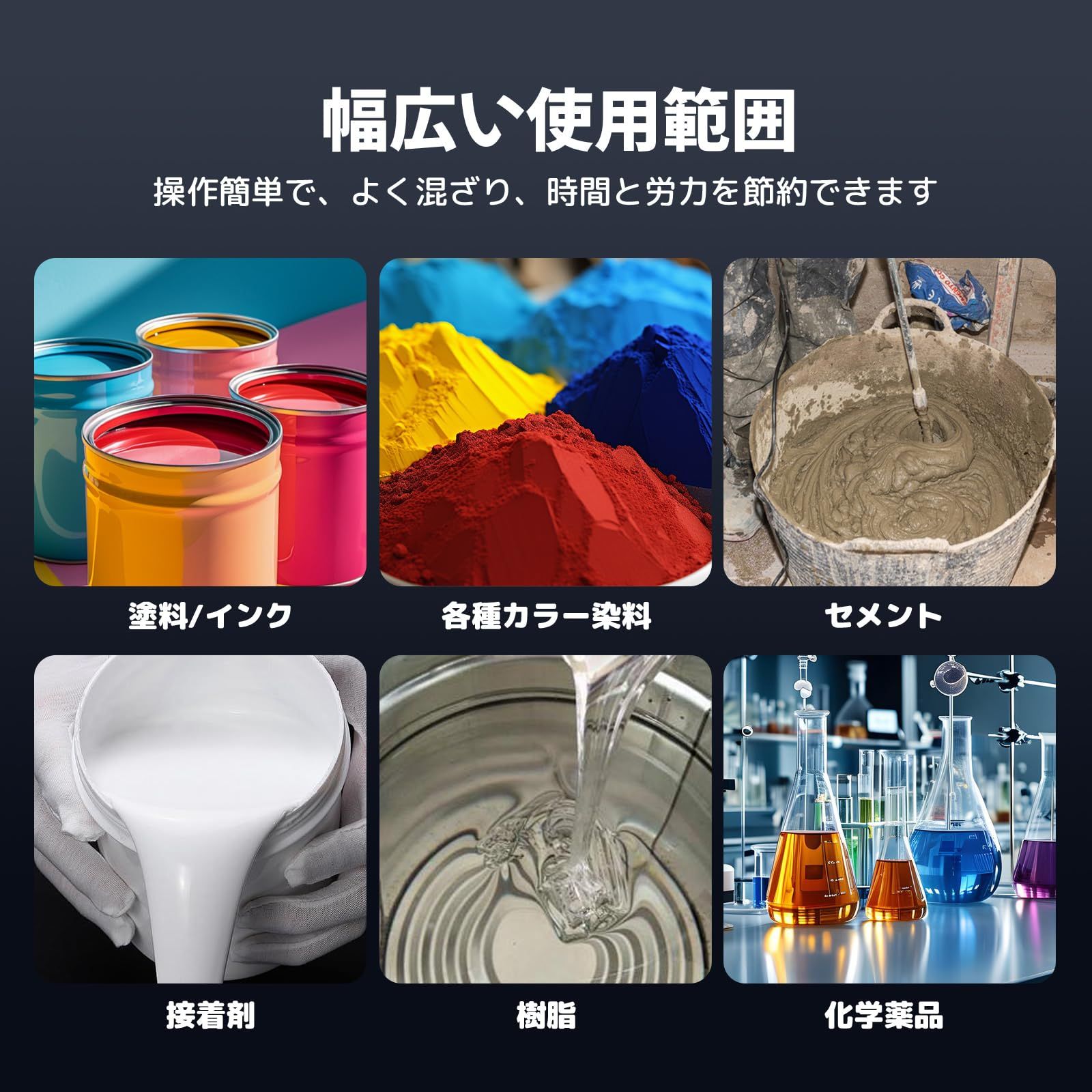 【幅広い使用範囲】さまざまな産業混合作業で広く使用されており、オイルペイント、セメント、飼料、樹脂、印刷インク、薄肉モルタル、石膏、セメント系接着剤、およびその他の材料の混合に適しています。