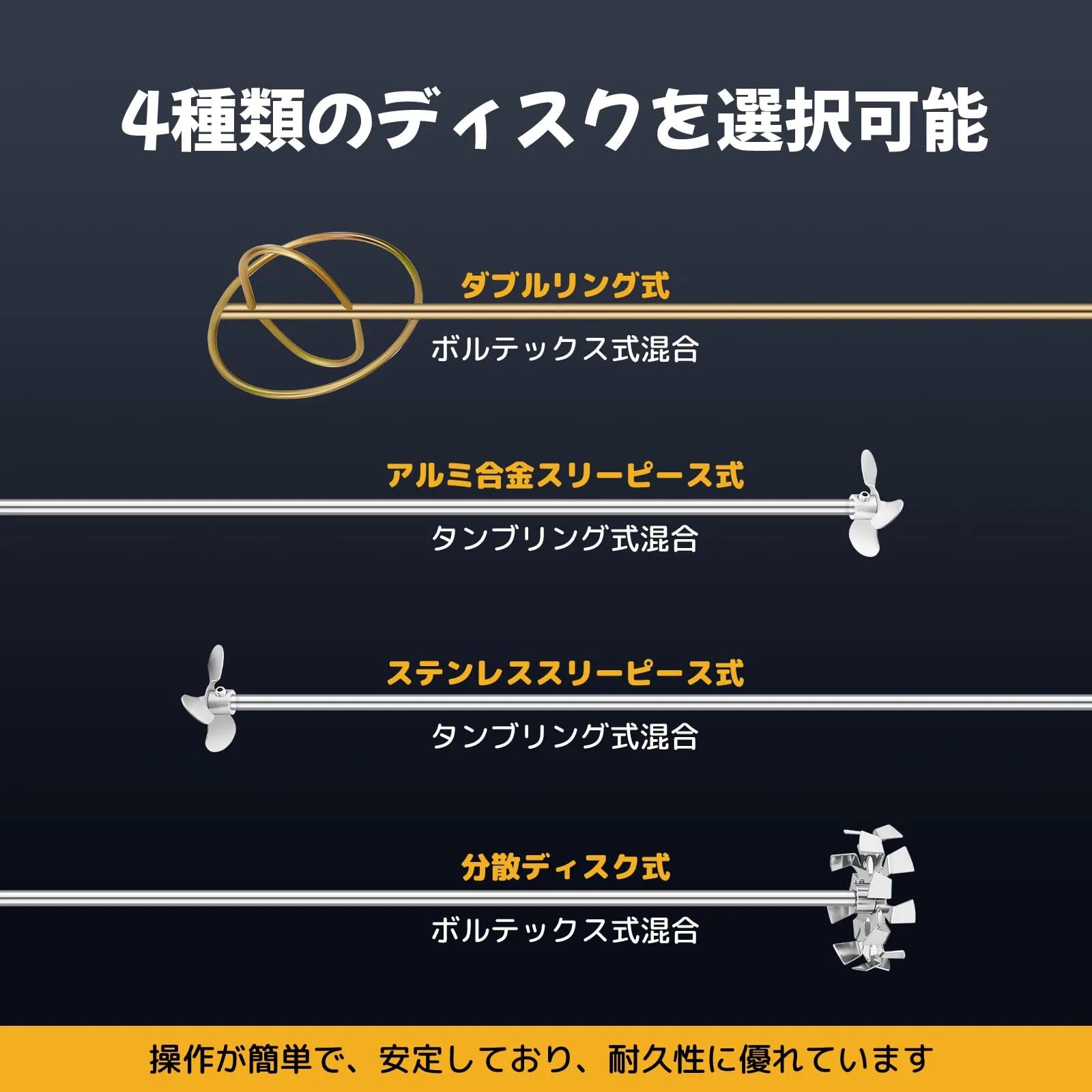 【長い耐用年数】攪拌棒と分散ディスクはステンレス鋼を使って、耐用年数が長く、速度と性能が安定しており、長時間連続運転にも耐える堅牢性と耐久性があります。